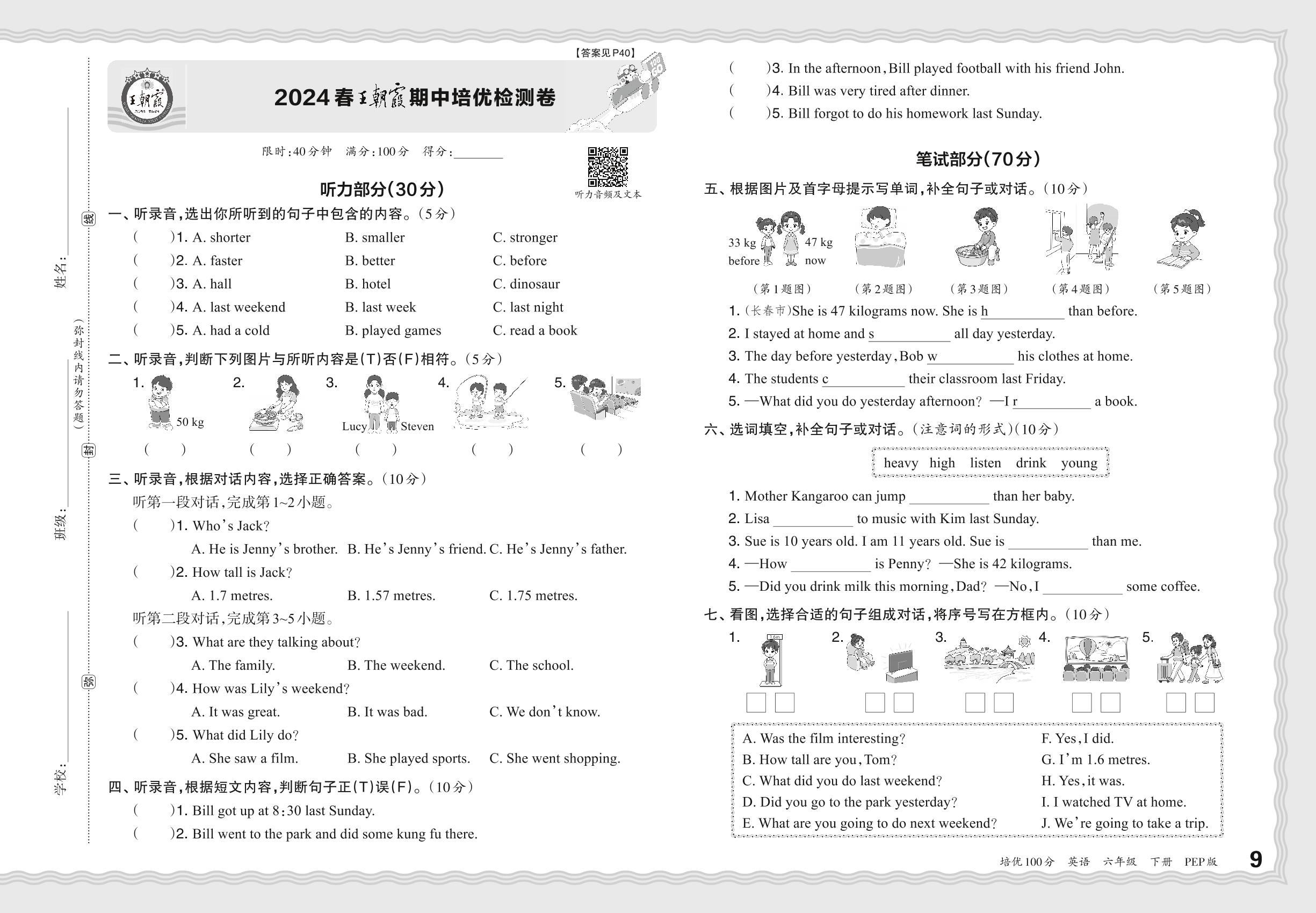 2024春下册六年级英语人教PEP版 王朝霞期中培优检测卷