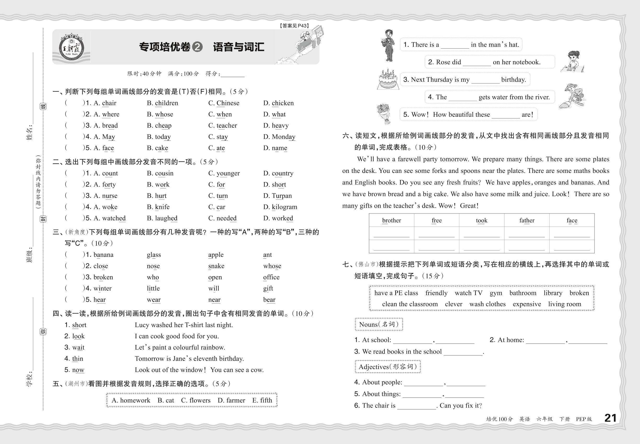 2024春下册六年级英语人教PEP版 期末专项卷PY版·语音与词汇【2】