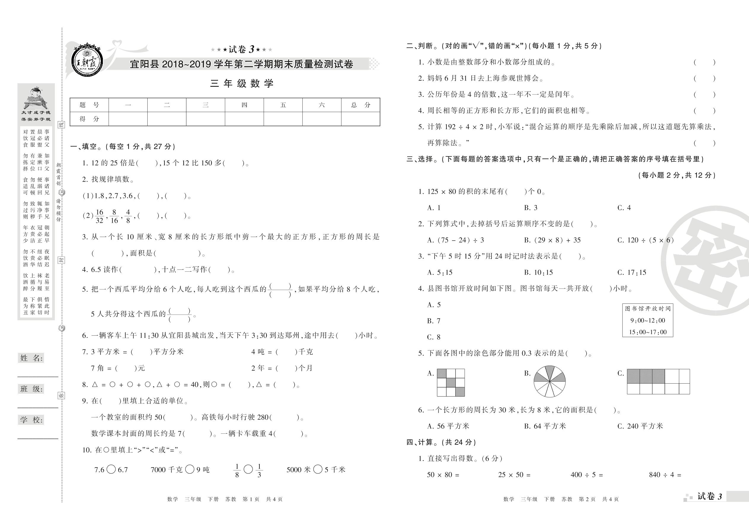 2018-2019学年第二学期洛阳市宜阳县三年级数学试卷(苏教版)【3】