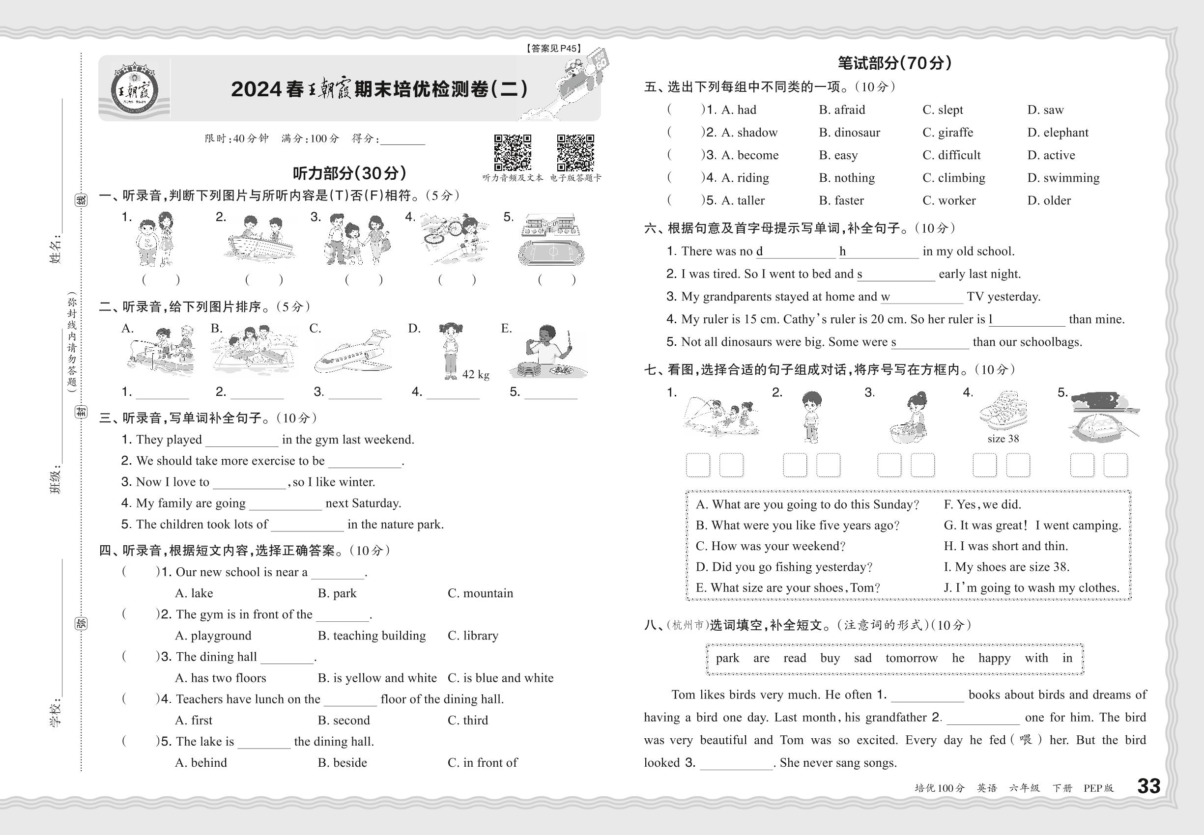 2024春下册六年级英语人教PEP版 王朝霞期末培优检测卷(二)