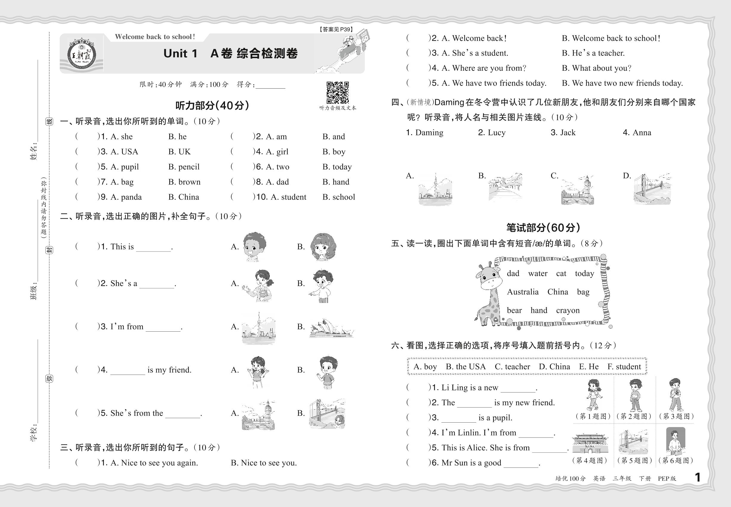 2024春下册三年级英语人教PEP版 Unit 1 A卷 综合检测卷