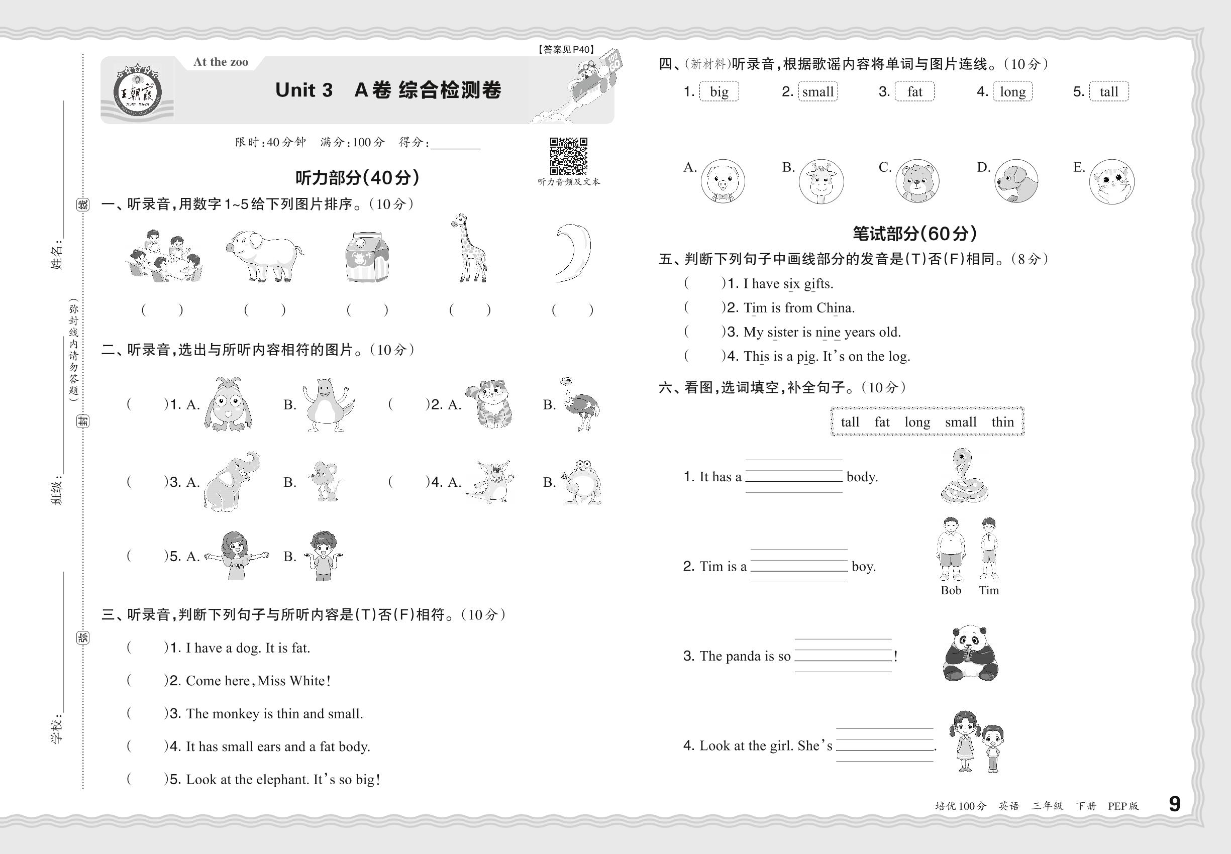 2024春下册三年级英语人教PEP版 Unit 3 A卷 综合检测卷