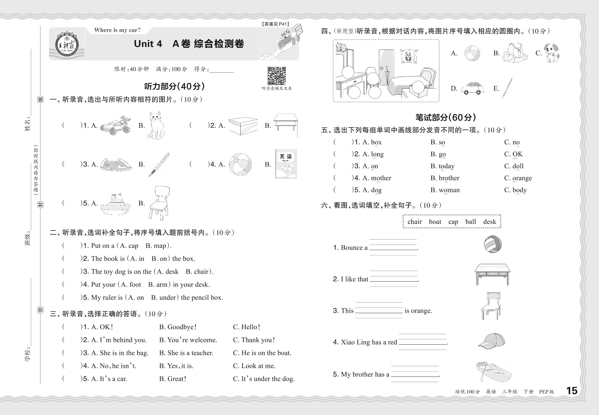 2024春下册三年级英语人教PEP版 Unit 4 A卷 综合检测卷