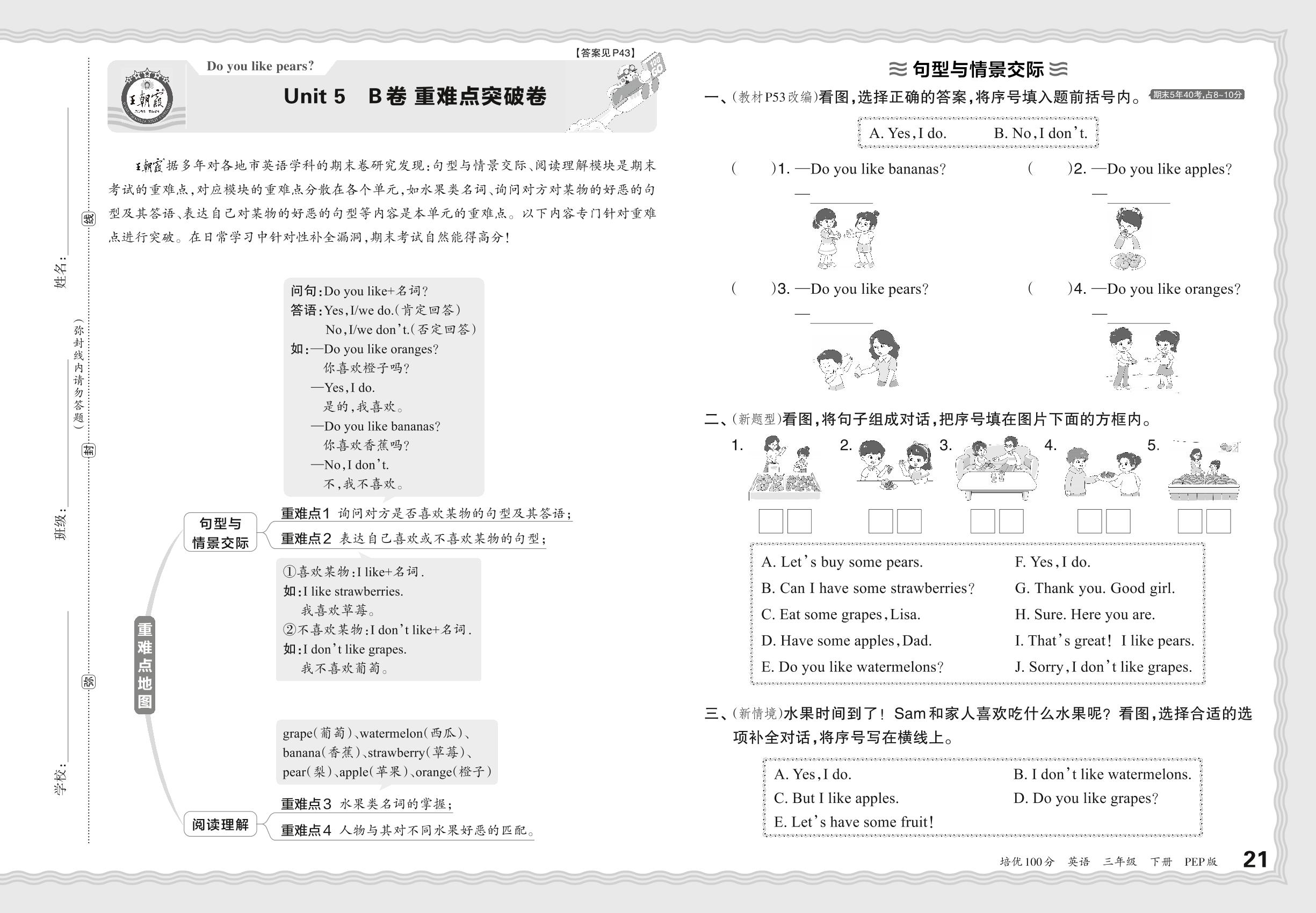 2024春下册三年级英语人教PEP版 Unit 5 B卷 重难点突破卷