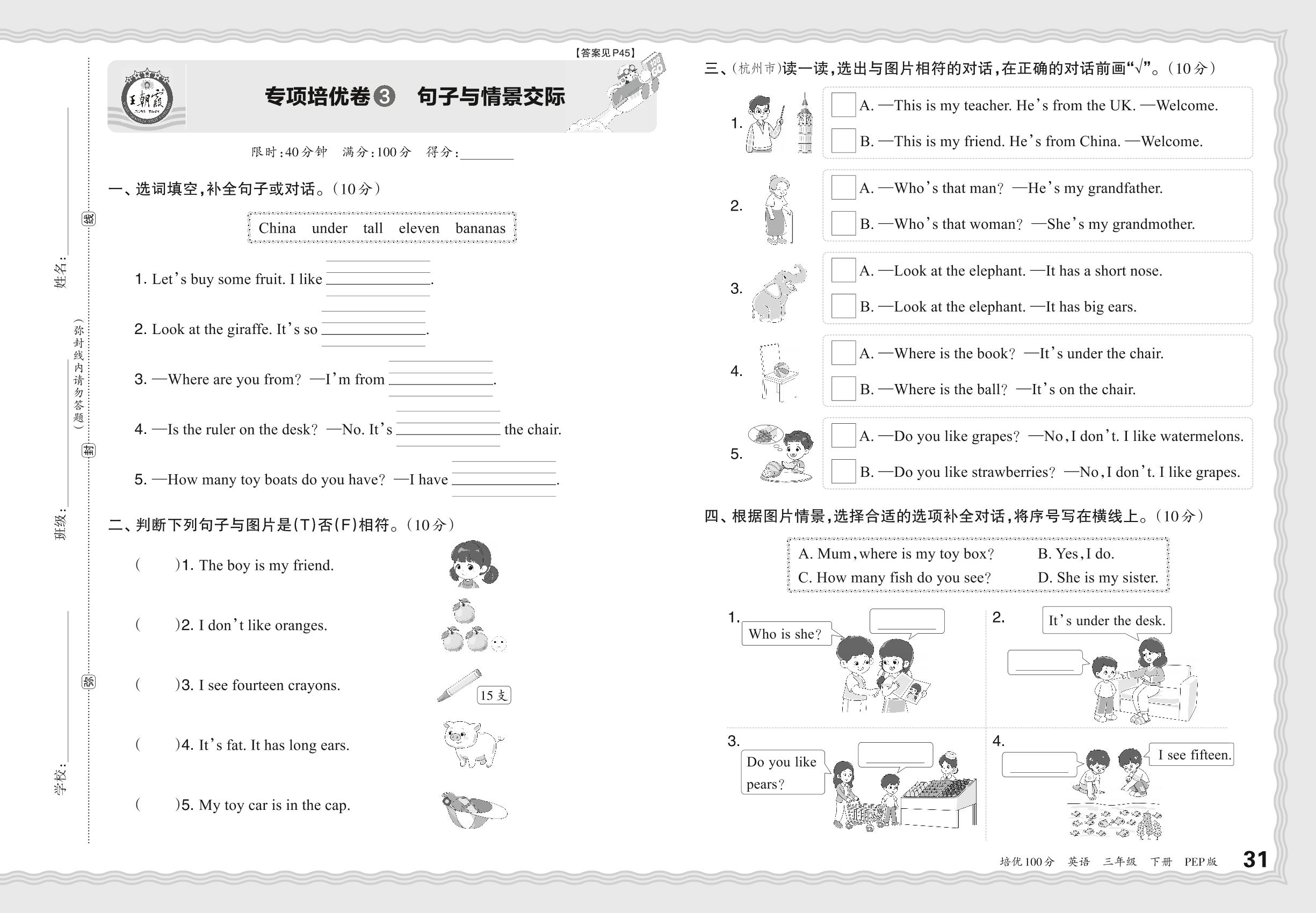 2024春下册三年级英语人教PEP版 期末专项卷PY版·句子与情景交际【3】