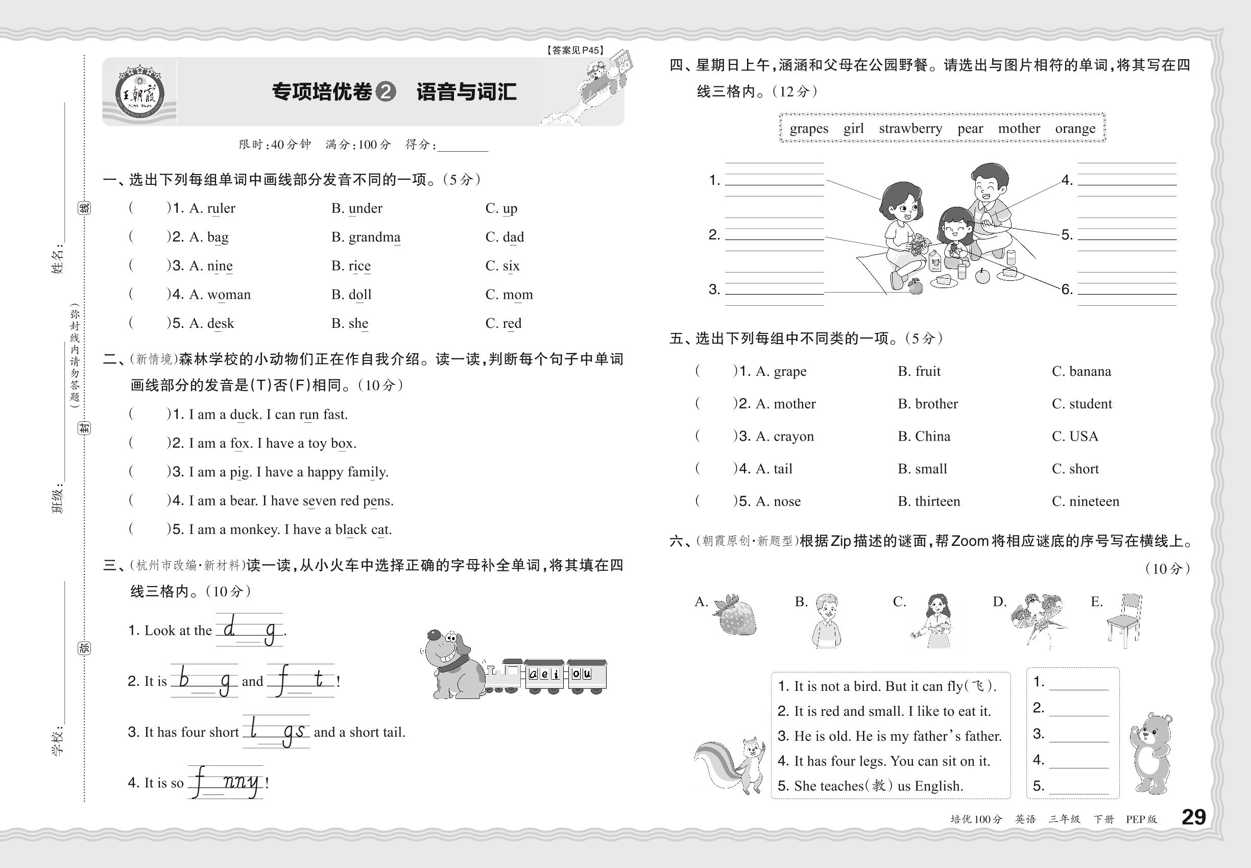 2024春下册三年级英语人教PEP版 期末专项卷PY版·语音与词汇【2】