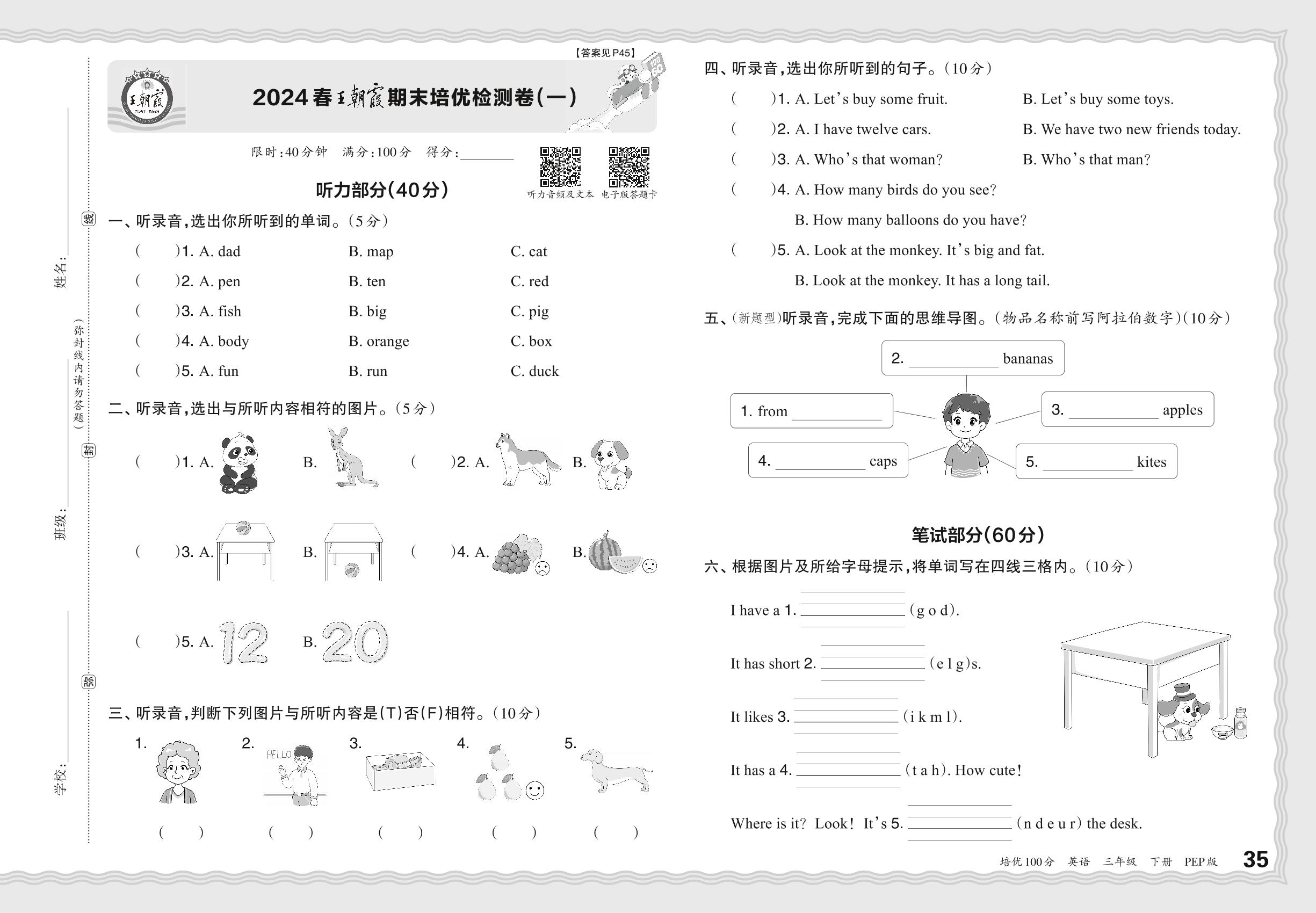 2024春下册三年级英语人教PEP版 王朝霞期末培优检测卷(一)