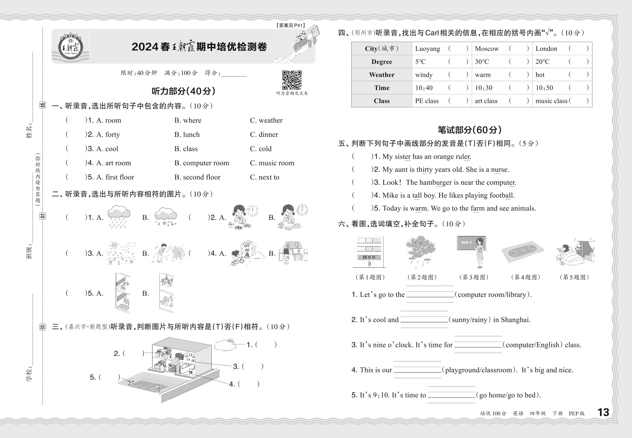 2024春下册四年级英语人教PEP版 王朝霞期中培优检测卷