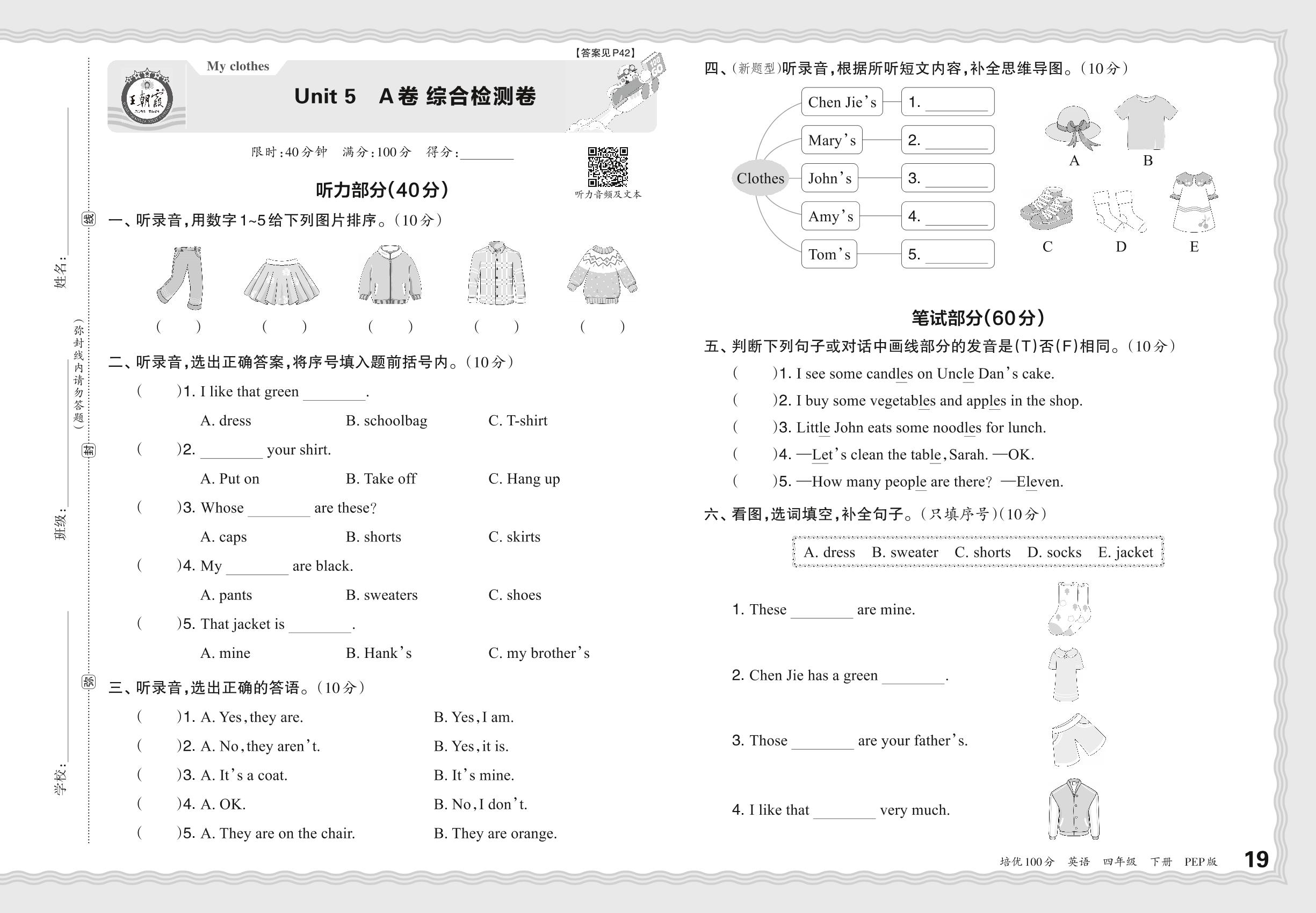 2024春下册四年级英语人教PEP版 Unit 5 A卷 综合检测卷