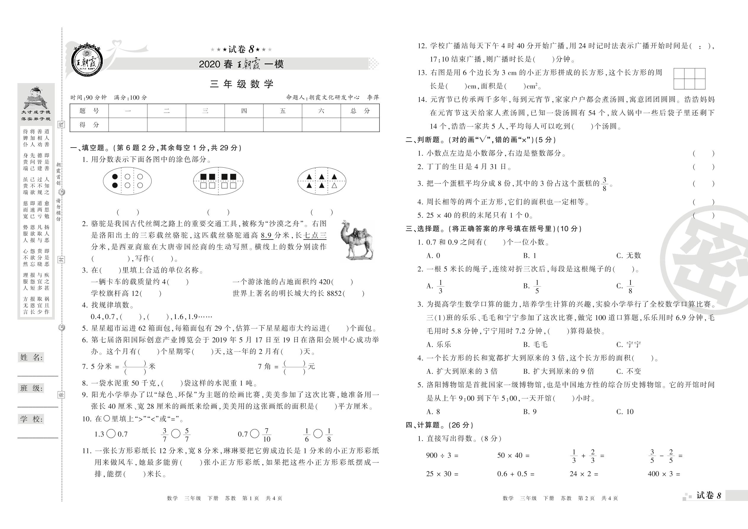 王朝霞期末模拟卷三年级下册数学(苏教版)_R21080493808【8】