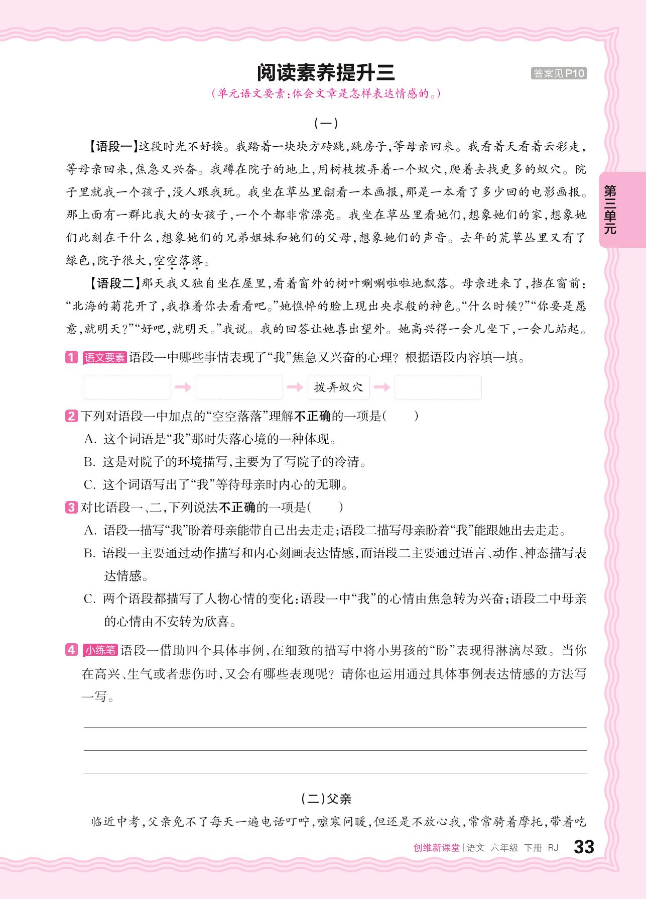 2024春下册六年级语文人教版 第三单元 表达真情实感——阅读素养提升三