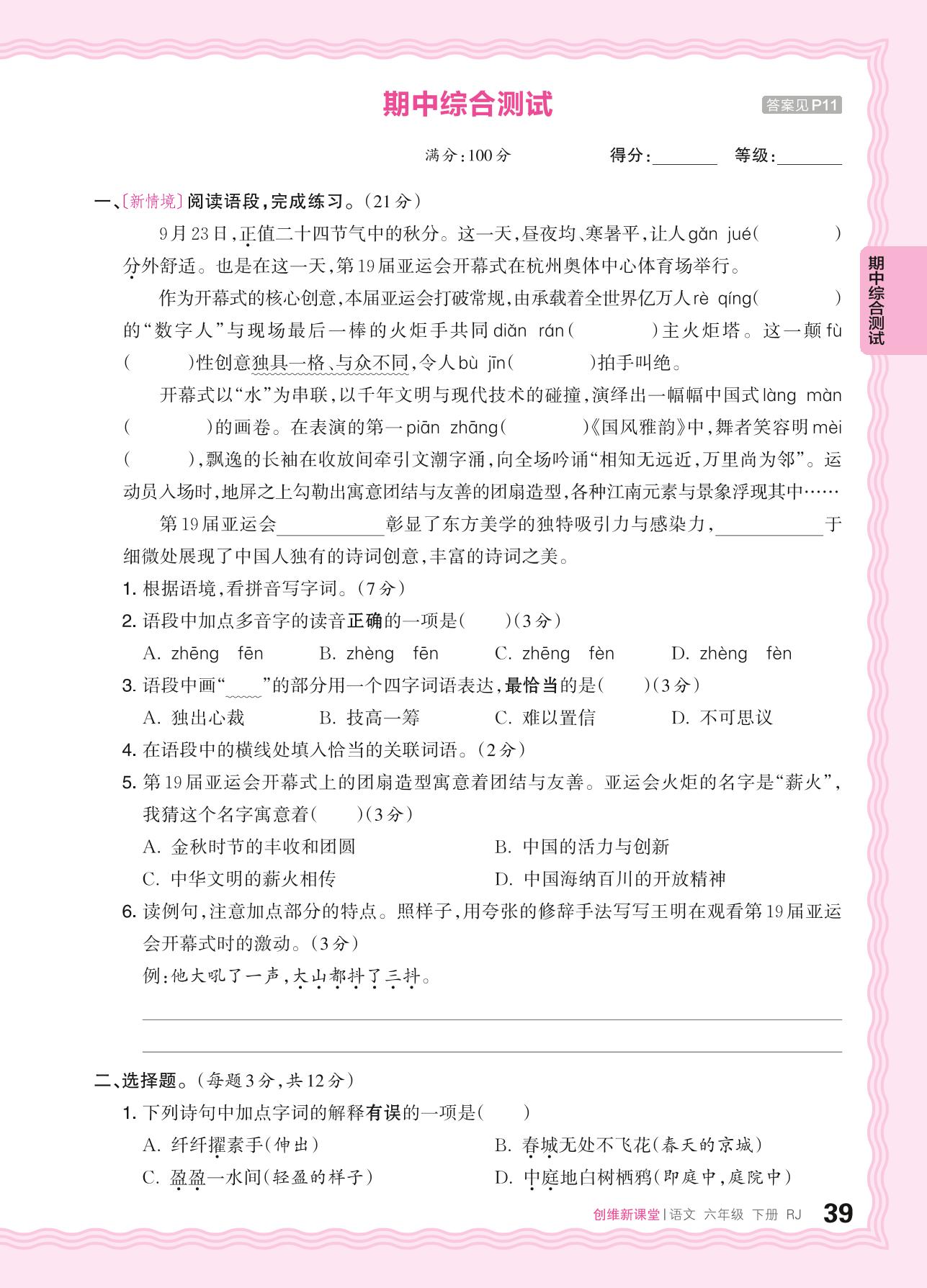 2024春下册六年级语文人教版 期中综合测试