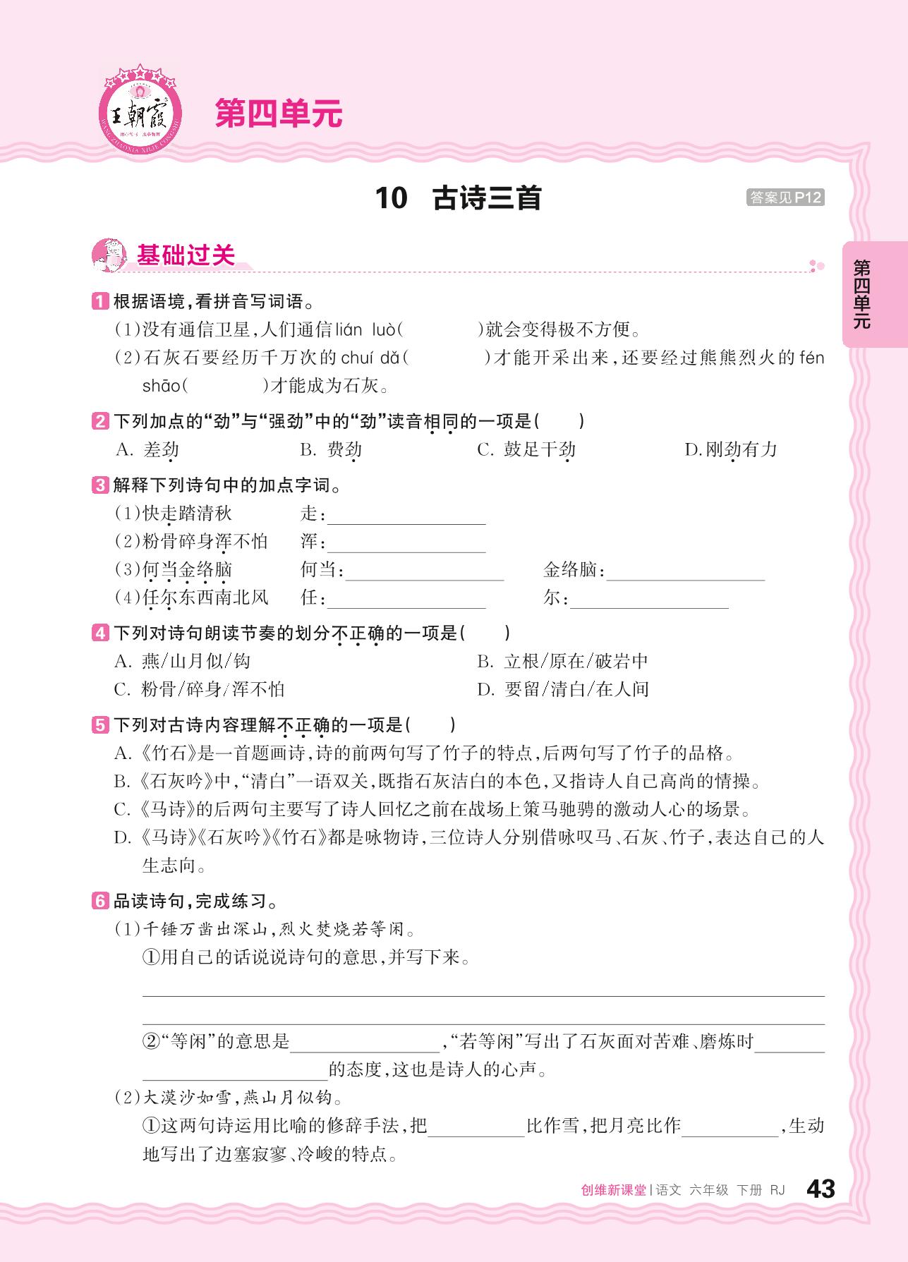 2024春下册六年级语文人教版 第四单元 理想和信念——10. 古诗三首