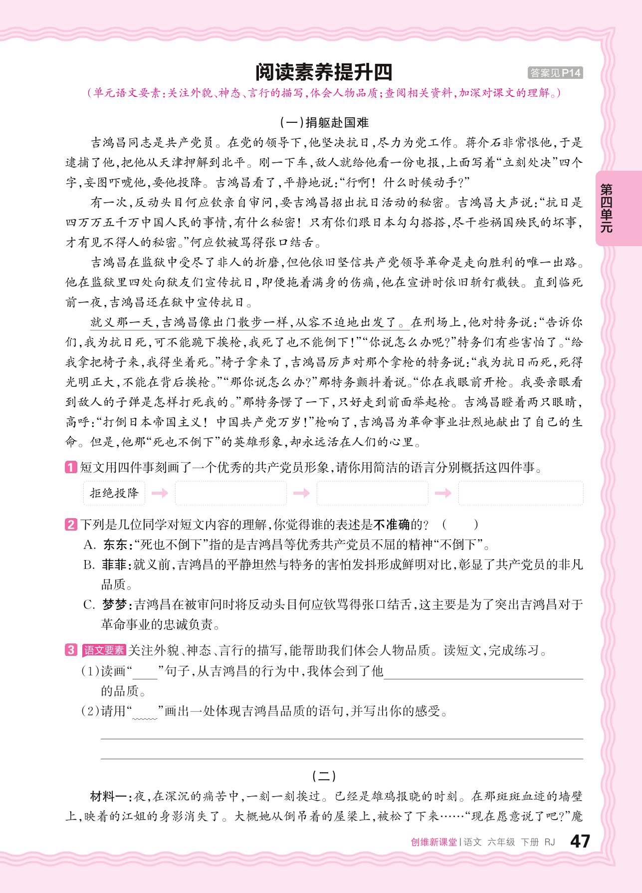 2024春下册六年级语文人教版 第四单元 理想和信念——阅读素养提升四
