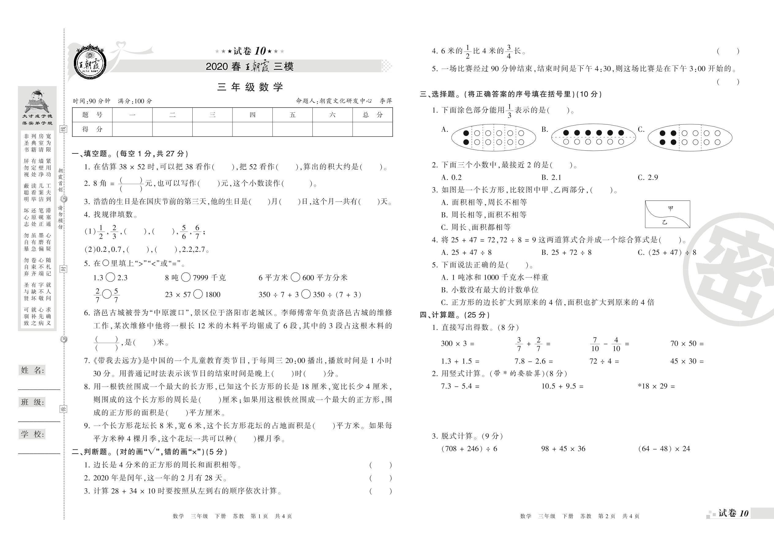 王朝霞期末模拟卷三年级下册数学(苏教版)_R21080493830【10】