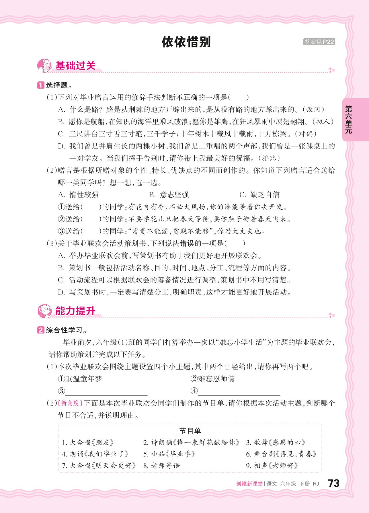 2024春下册六年级语文人教版 第六单元 难忘小学生活——依依惜别