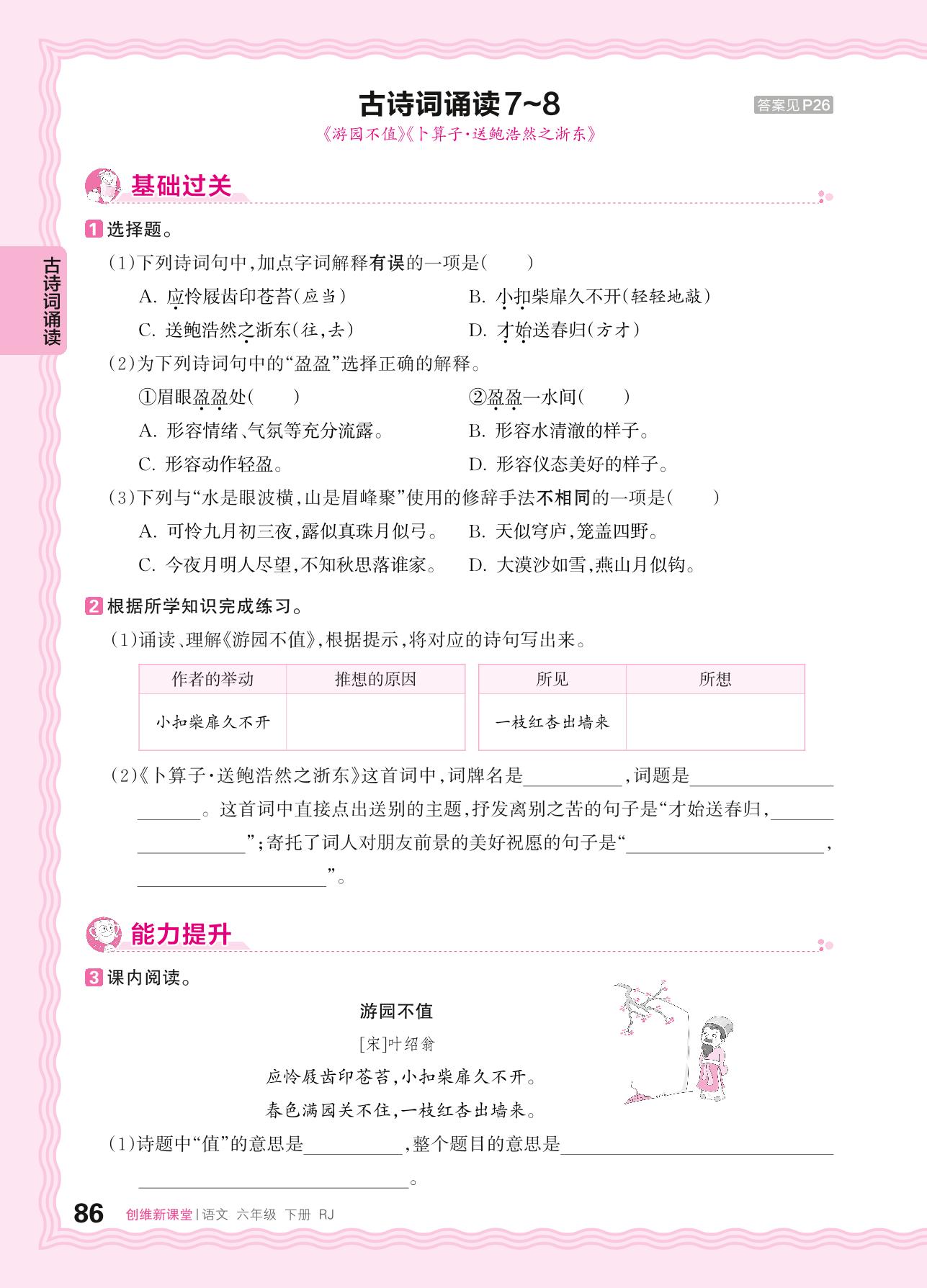 2024春下册六年级语文人教版 古诗词诵读——古诗词诵读7~8《游园不值》《卜算子·送鲍浩然之浙东》
