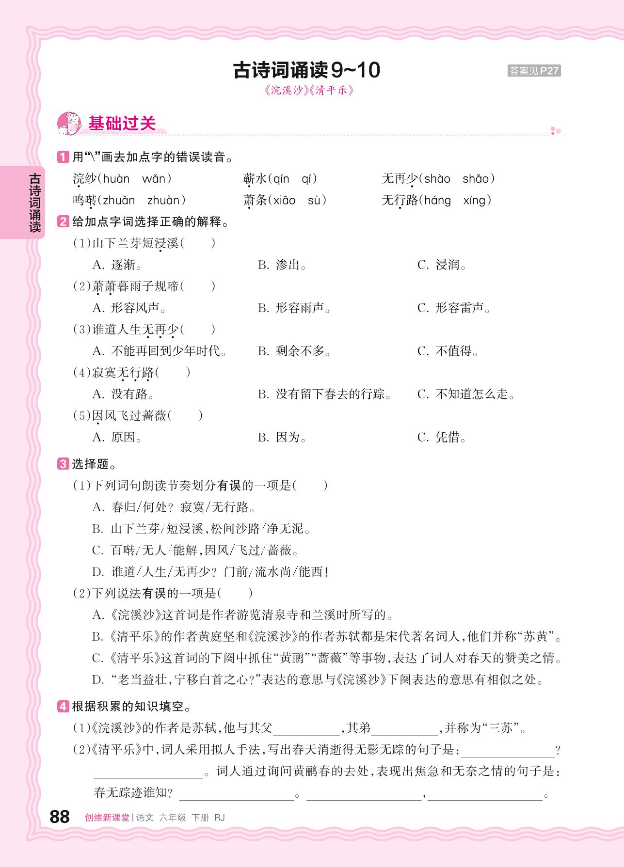 2024春下册六年级语文人教版 古诗词诵读——古诗词诵读9~10《浣溪沙》《清平乐》