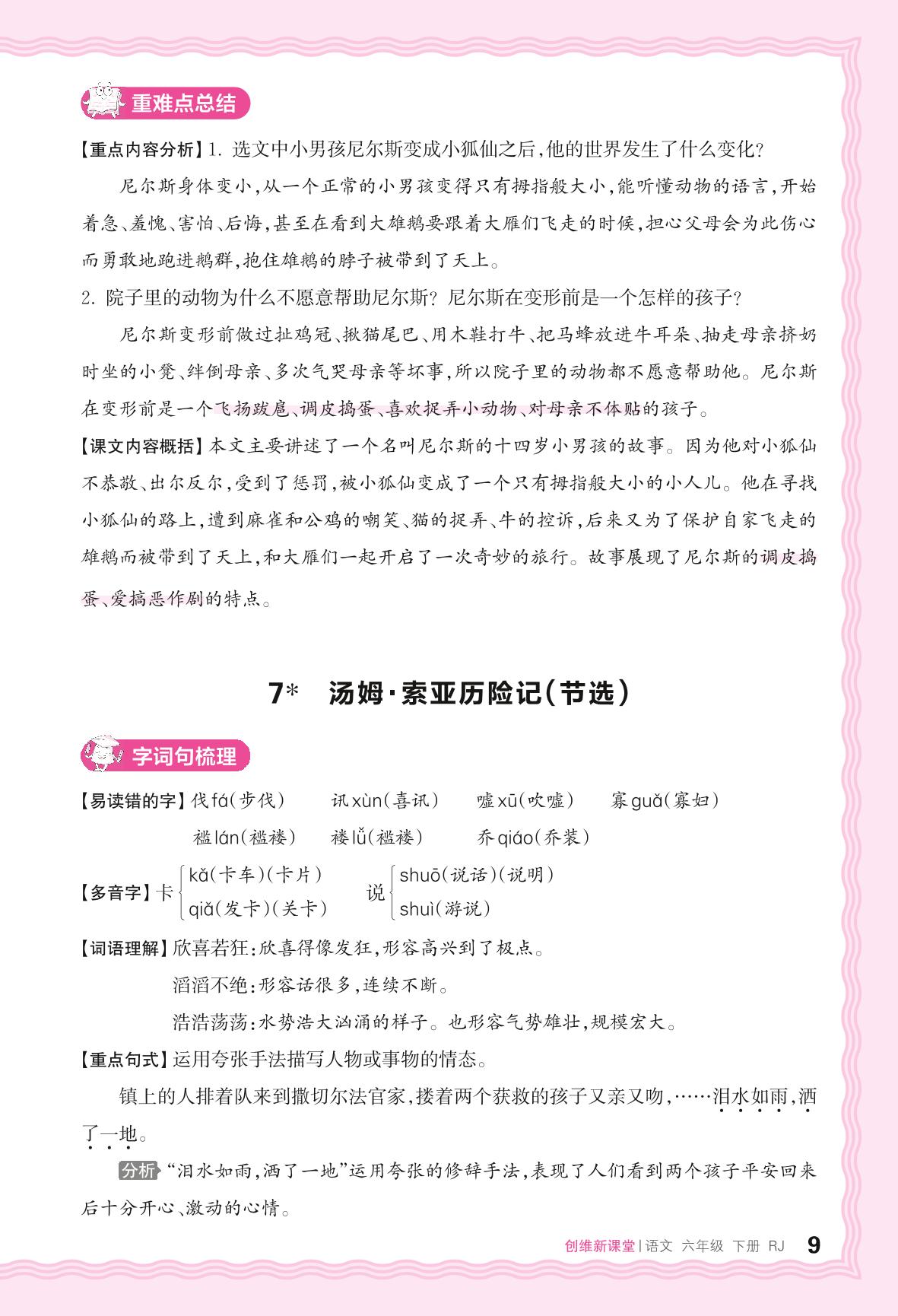 2024春下册六年级语文人教版 助学手册 第二单元——7. 汤姆·索亚历险记(节选)