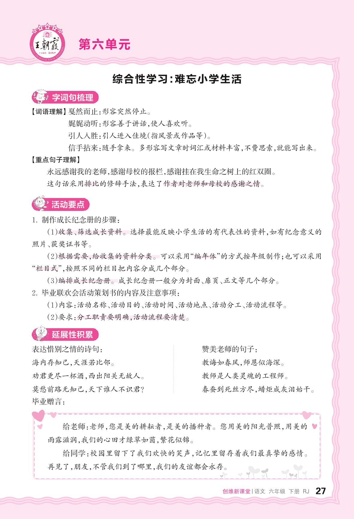 2024春下册六年级语文人教版 助学手册 第六单元——综合性学习:难忘小学生活