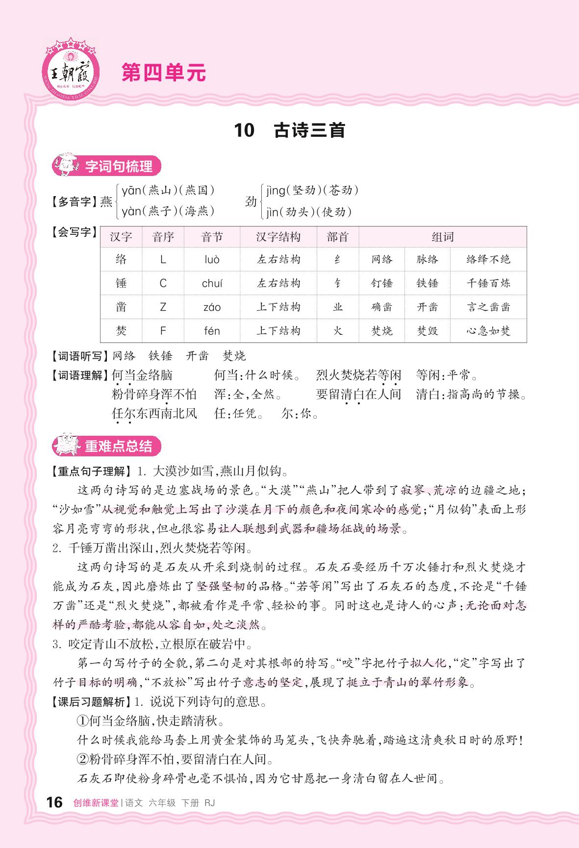 2024春下册六年级语文人教版 助学手册 第四单元——10. 古诗三首