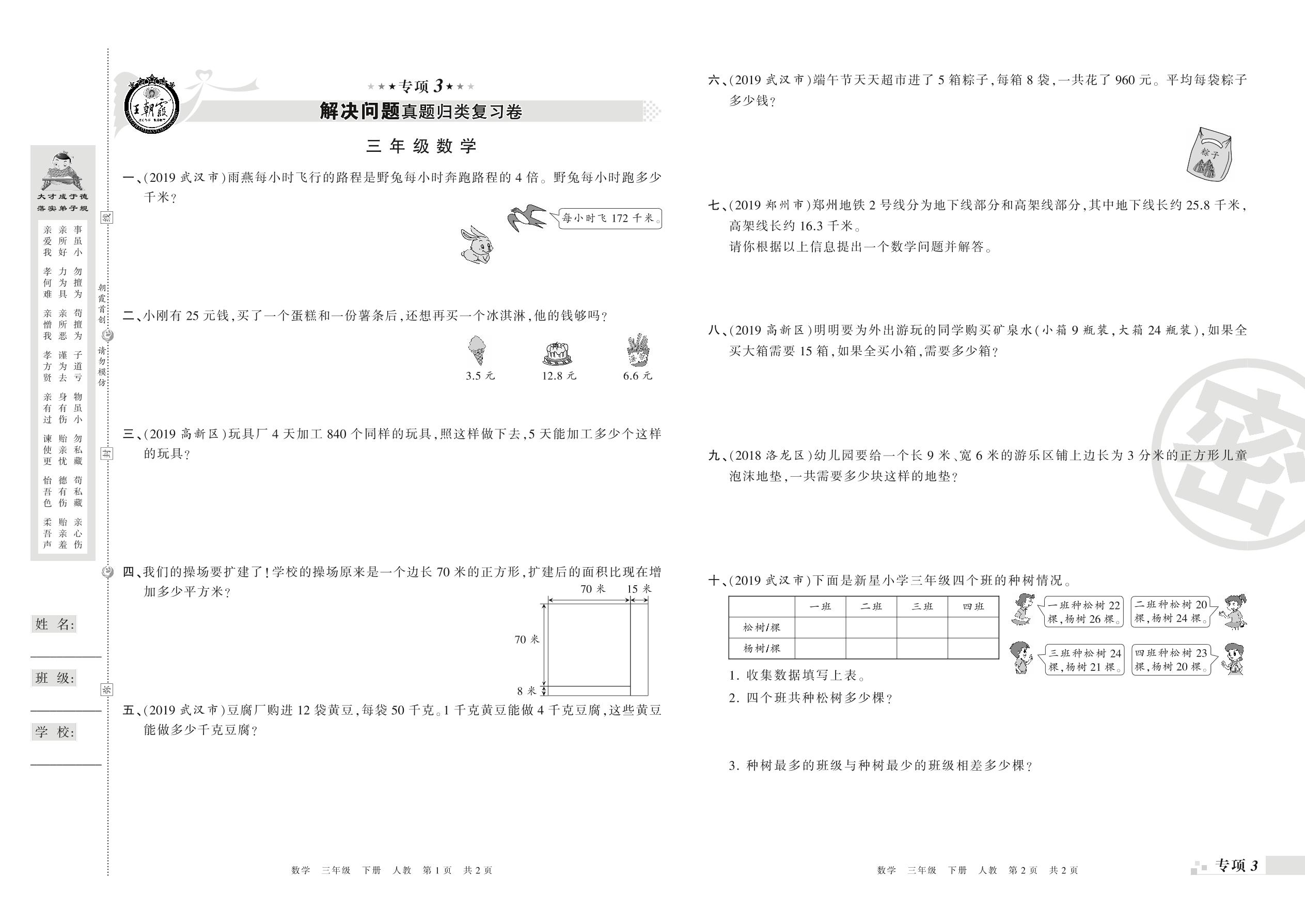 王朝霞期末专项卷——解决问题真题归类复习卷、新颖题速递:生活与数学三年级下册数学(人教版)_R21080493855【0】
