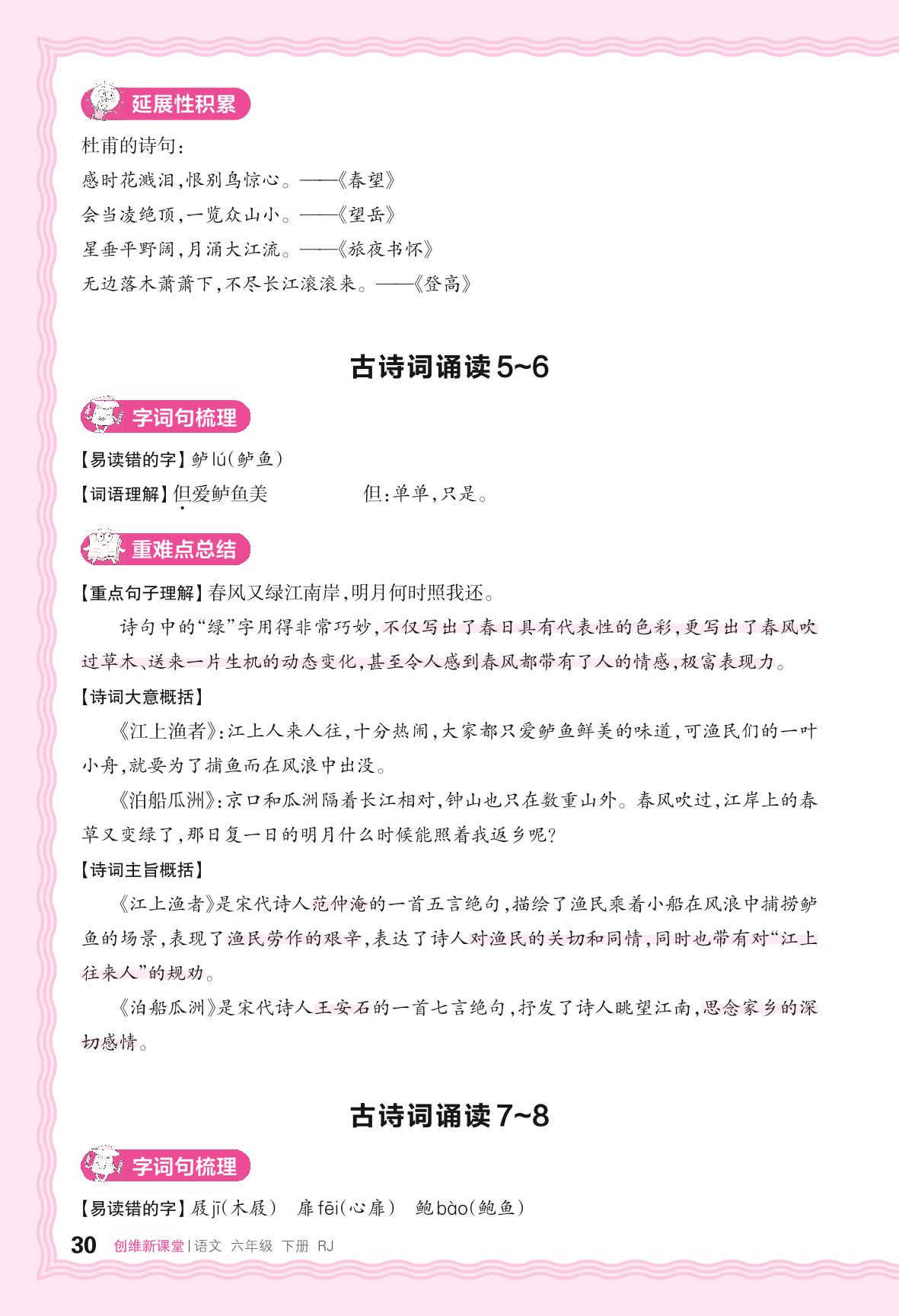 2024春下册六年级语文人教版 助学手册 古诗词诵读——古诗词诵读5~6《江上渔者》《泊船瓜洲》