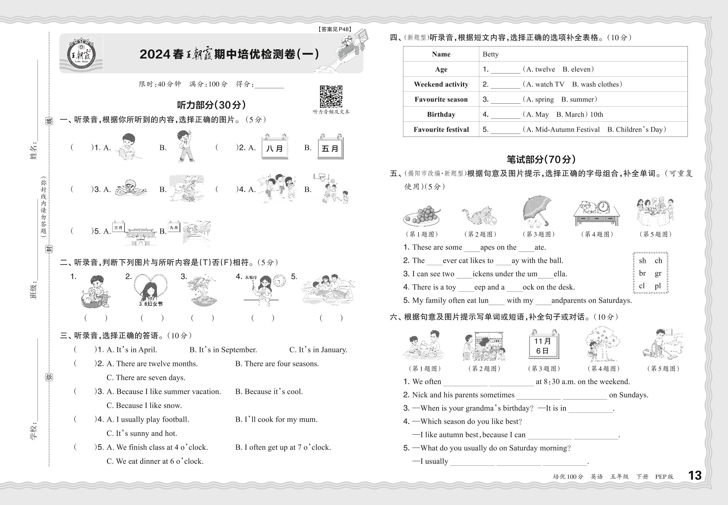 2024春下册五年级英语人教PEP版 王朝霞期中培优检测卷(一)