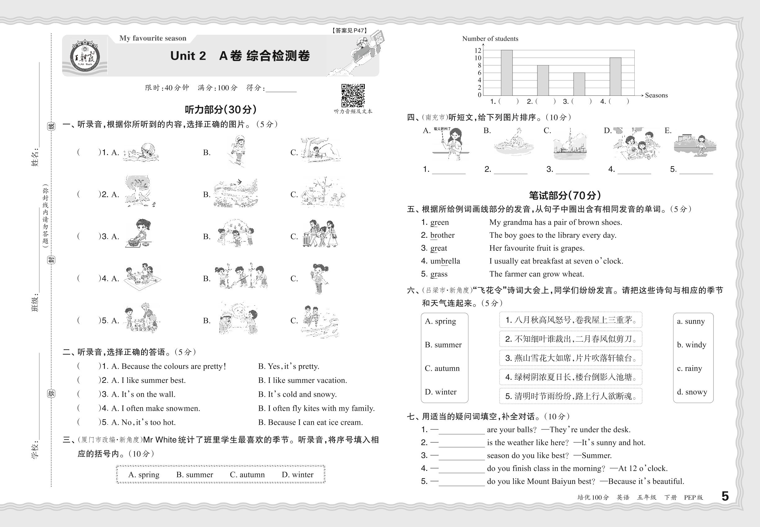 2024春下册五年级英语人教PEP版 Unit 2 A卷 综合检测卷