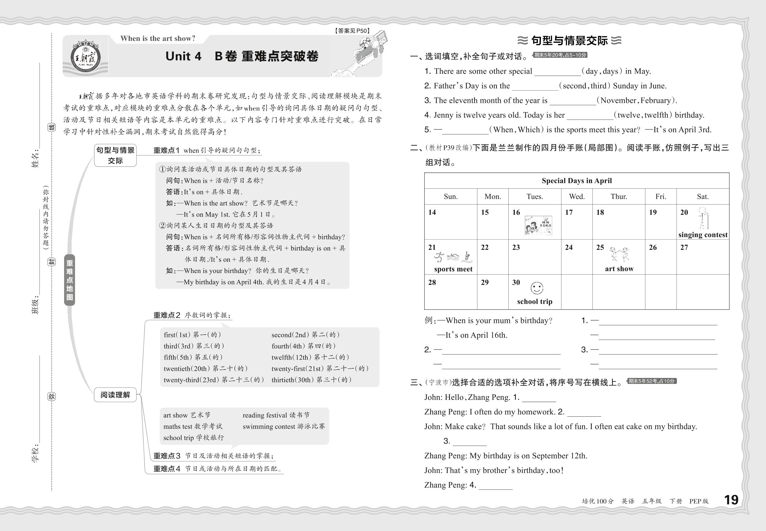 2024春下册五年级英语人教PEP版 Unit 4 B卷 重难点突破卷