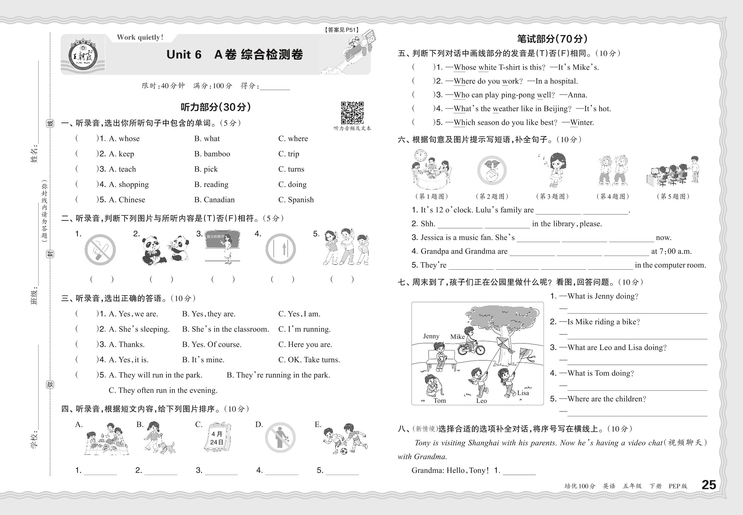2024春下册五年级英语人教PEP版 Unit 6 A卷 综合检测卷