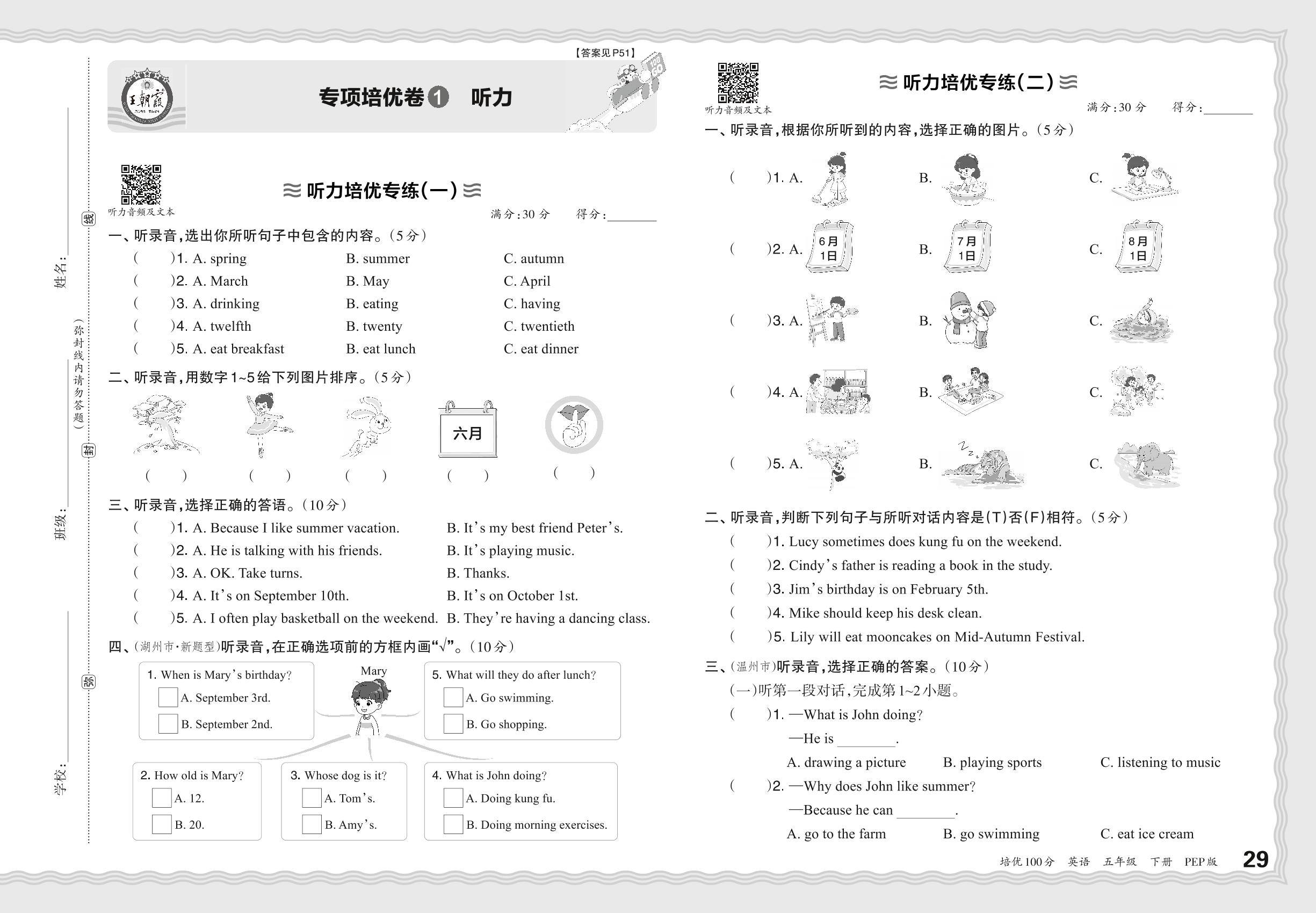2024春下册五年级英语人教PEP版 期末专项卷PY版·听力【1】