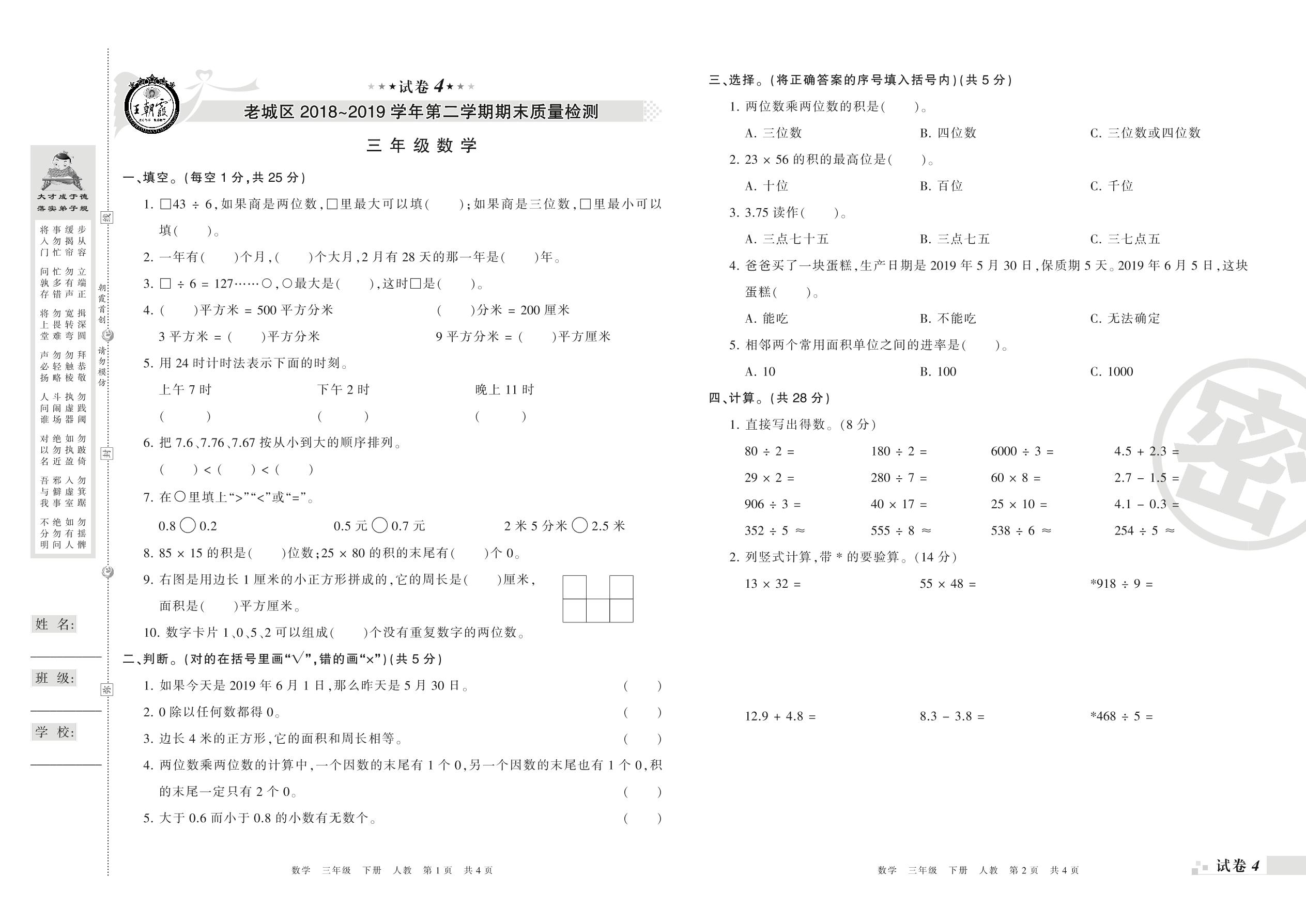 2018-2019学年第二学期洛阳市老城区三年级数学试卷(人教版)【4】