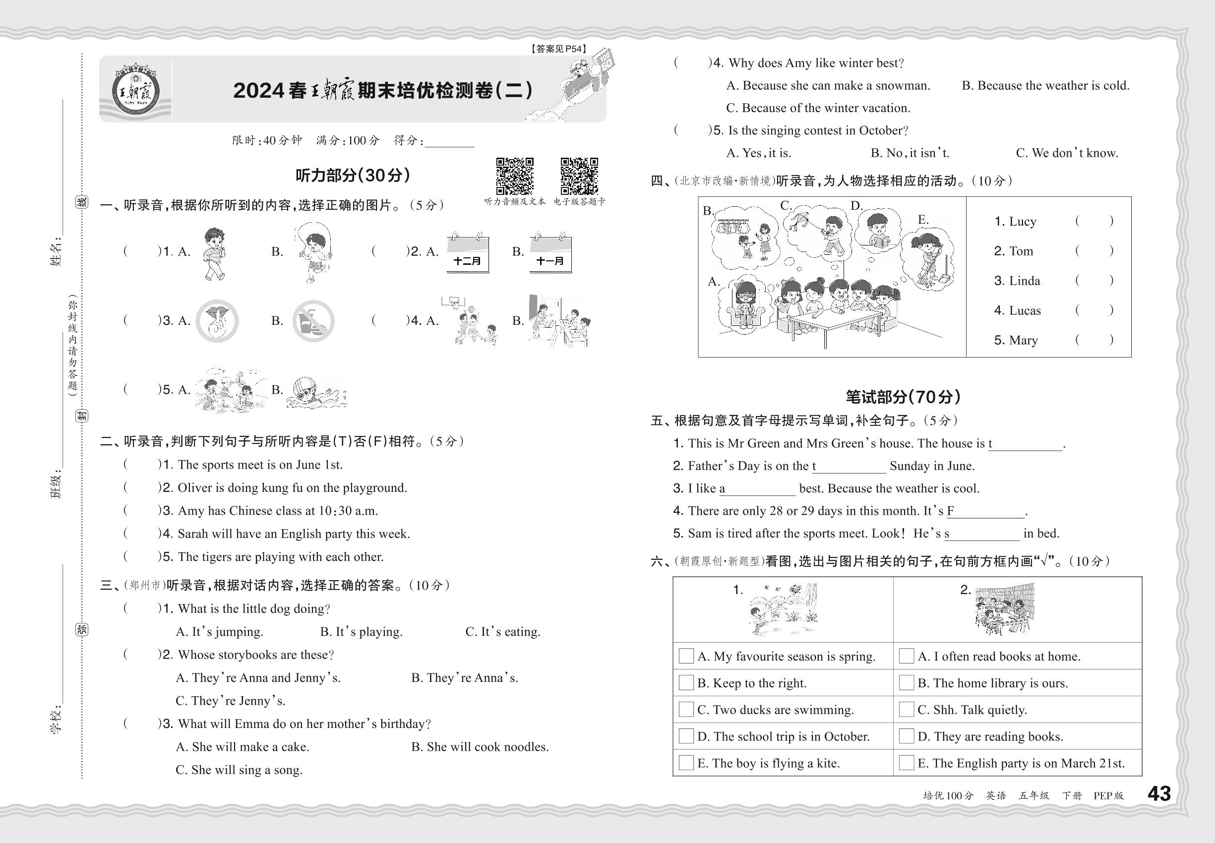 2024春下册五年级英语人教PEP版 王朝霞期末培优检测卷(二)