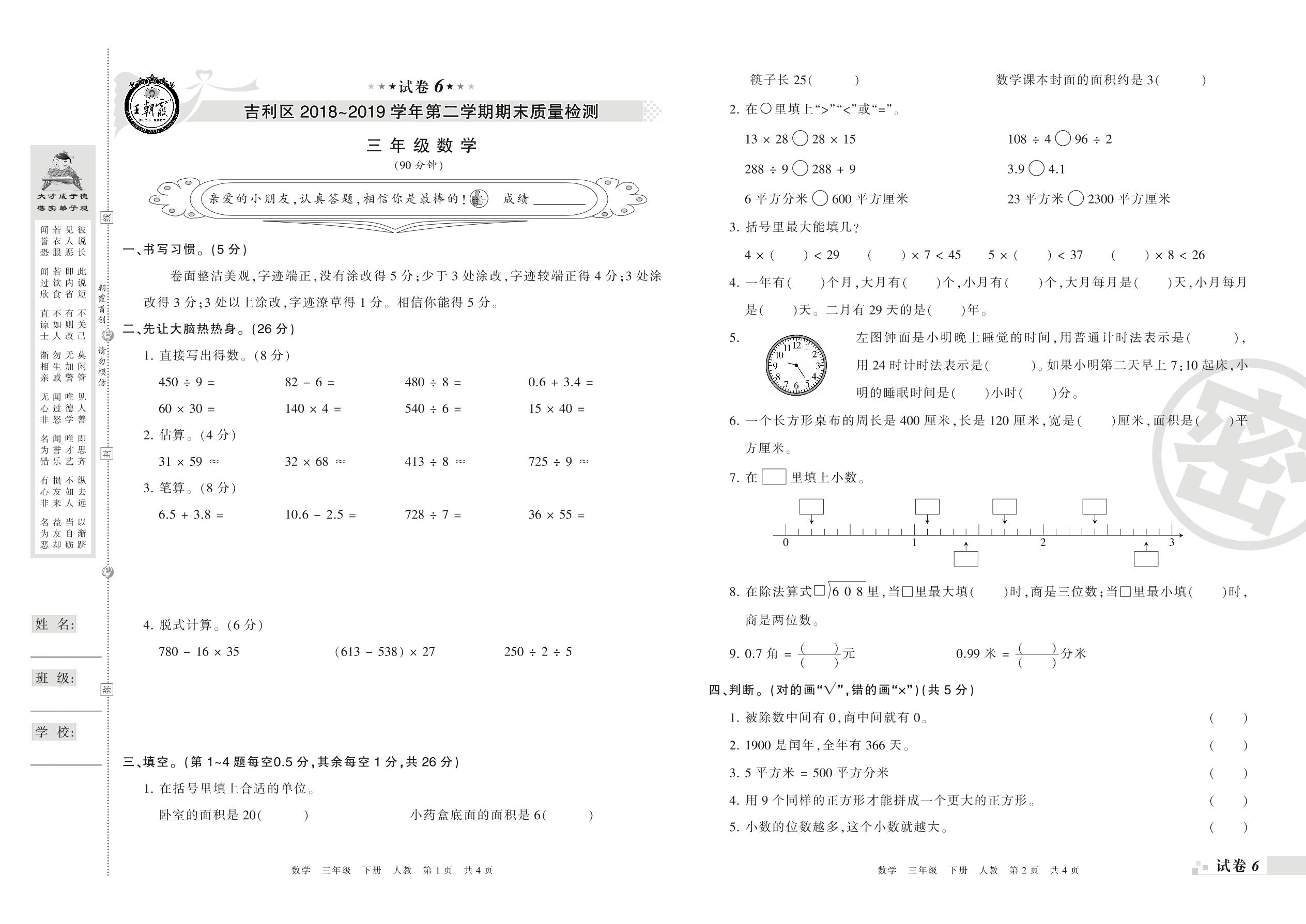 2018-2019学年第二学期洛阳市吉利区三年级数学试卷(人教版)【6】
