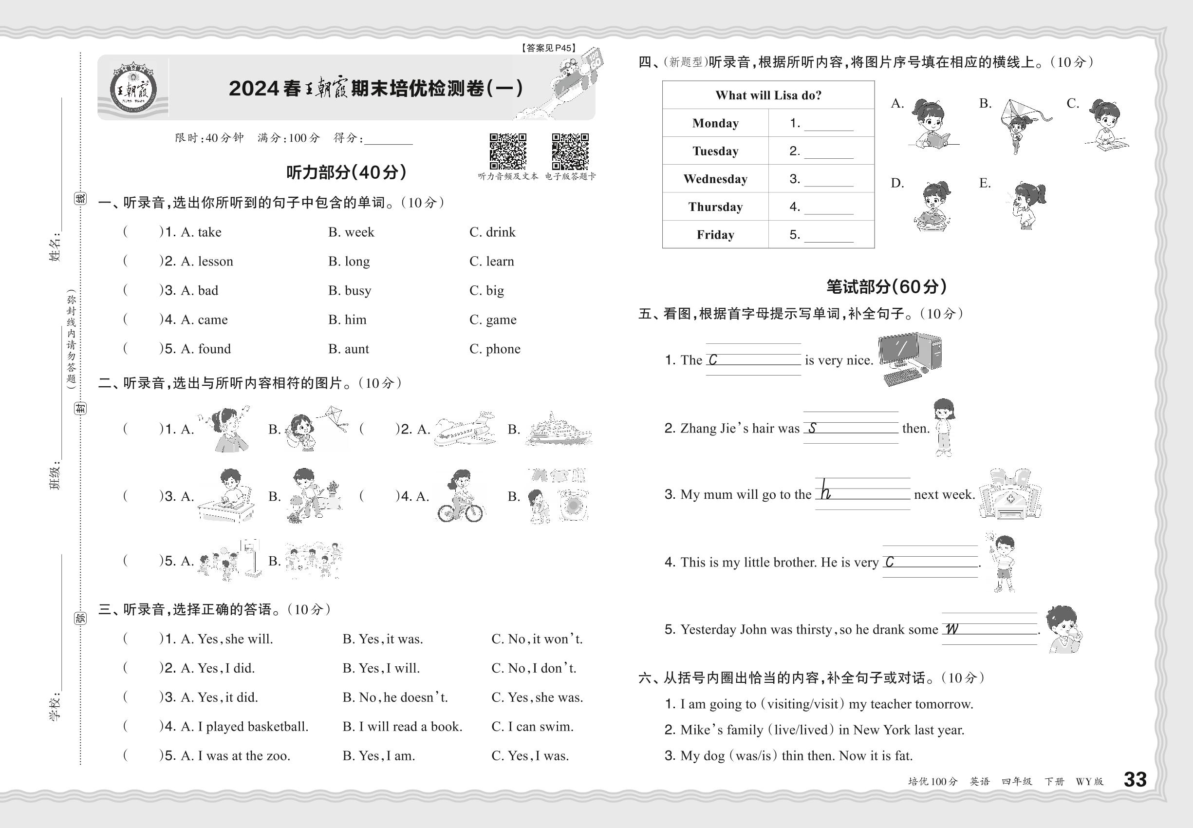 2024春下册四年级英语外研版 王朝霞期末培优检测卷(一)