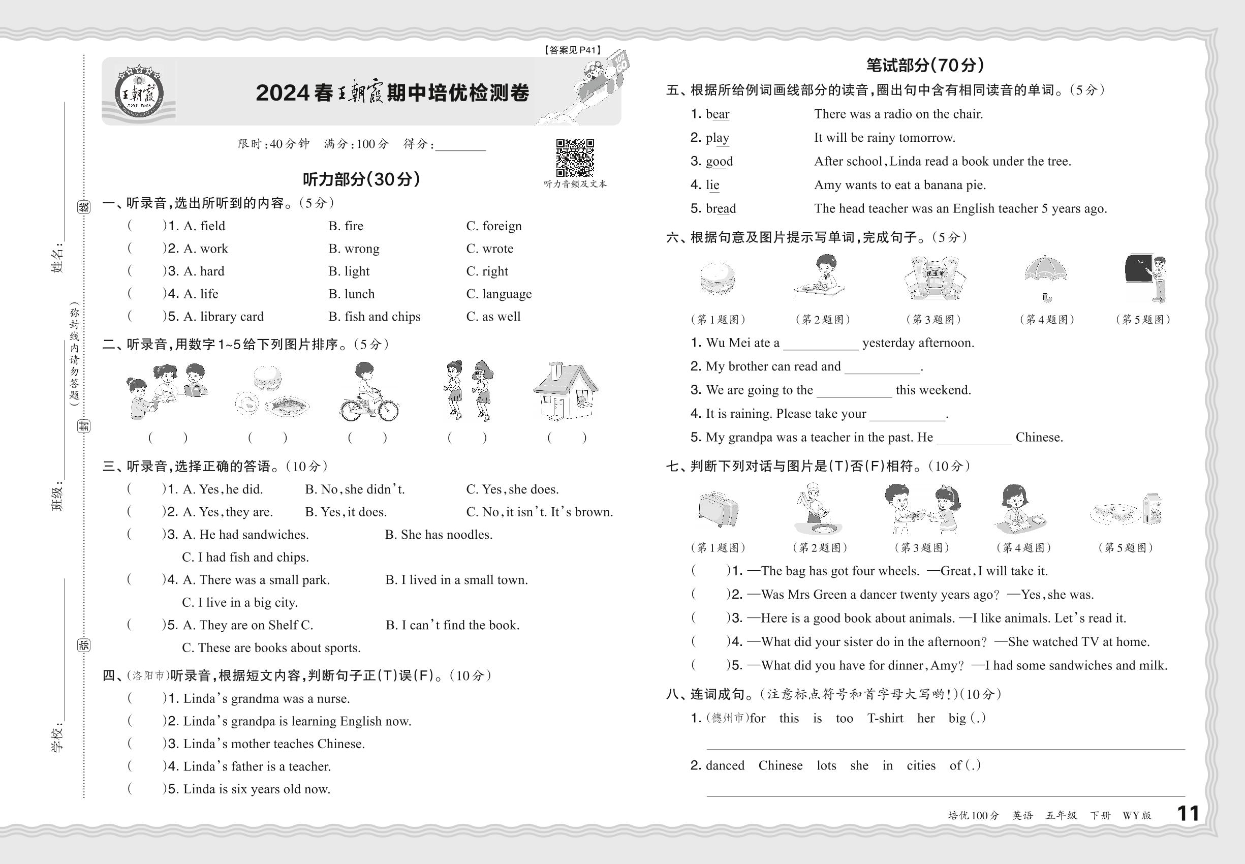 2024春下册五年级英语外研版 王朝霞期中培优检测卷