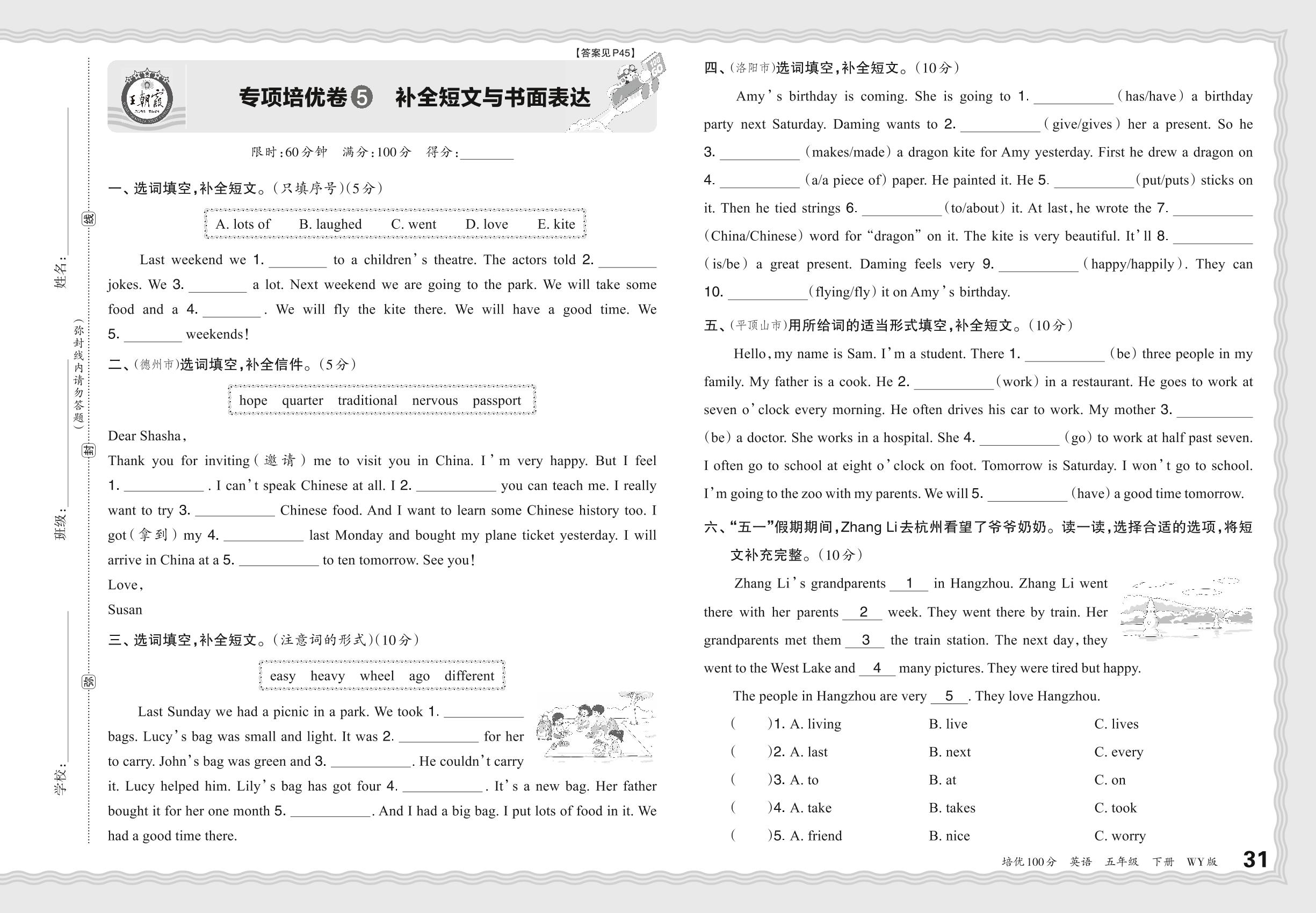 2024春下册五年级英语外研版 期末专项卷PY版·补全短文与书面表达【5】