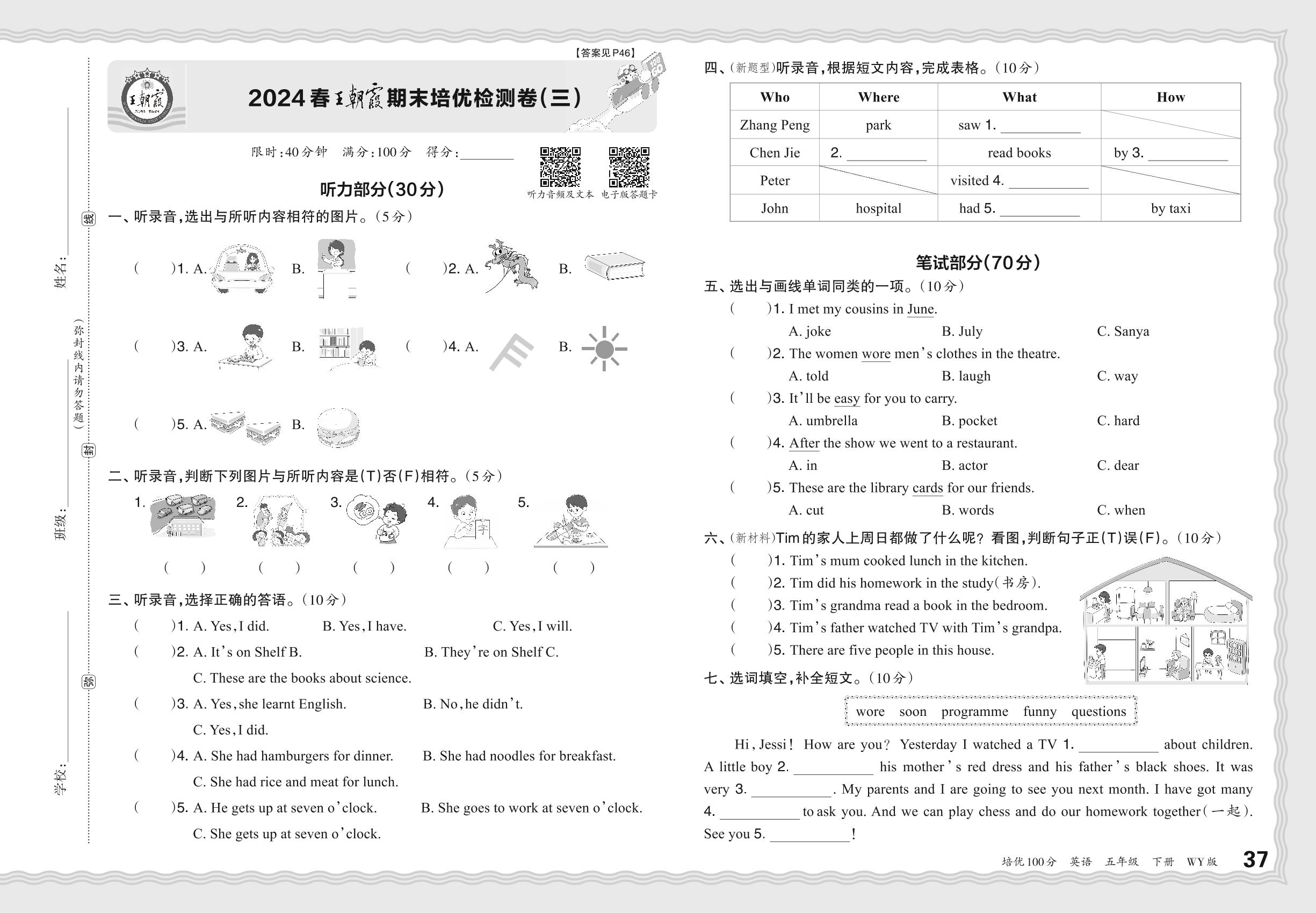 2024春下册五年级英语外研版 王朝霞期末培优检测卷(三)