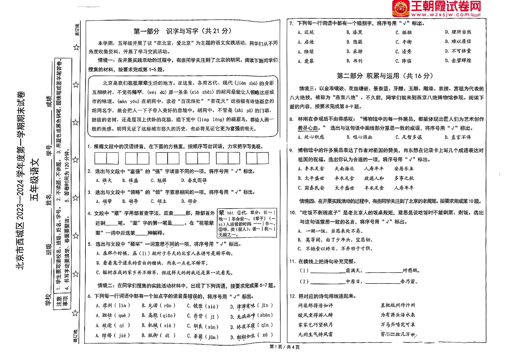 北京市西城区2023-2024学年度第一学期期末试卷五年级语文(人教版)