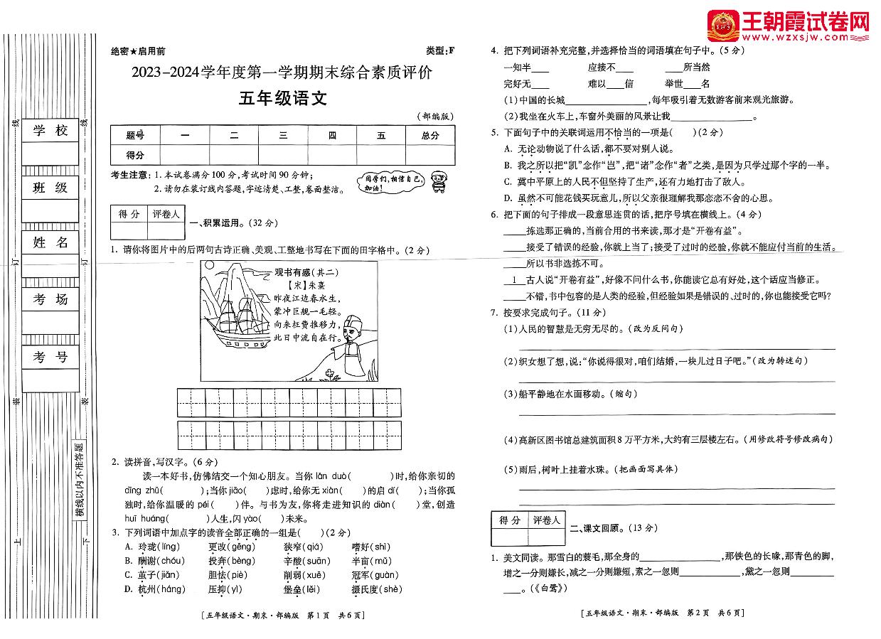 陕西省延安市富县2023-2024学年度第一学期期末综合素质评价试卷五年级语文(人教版)