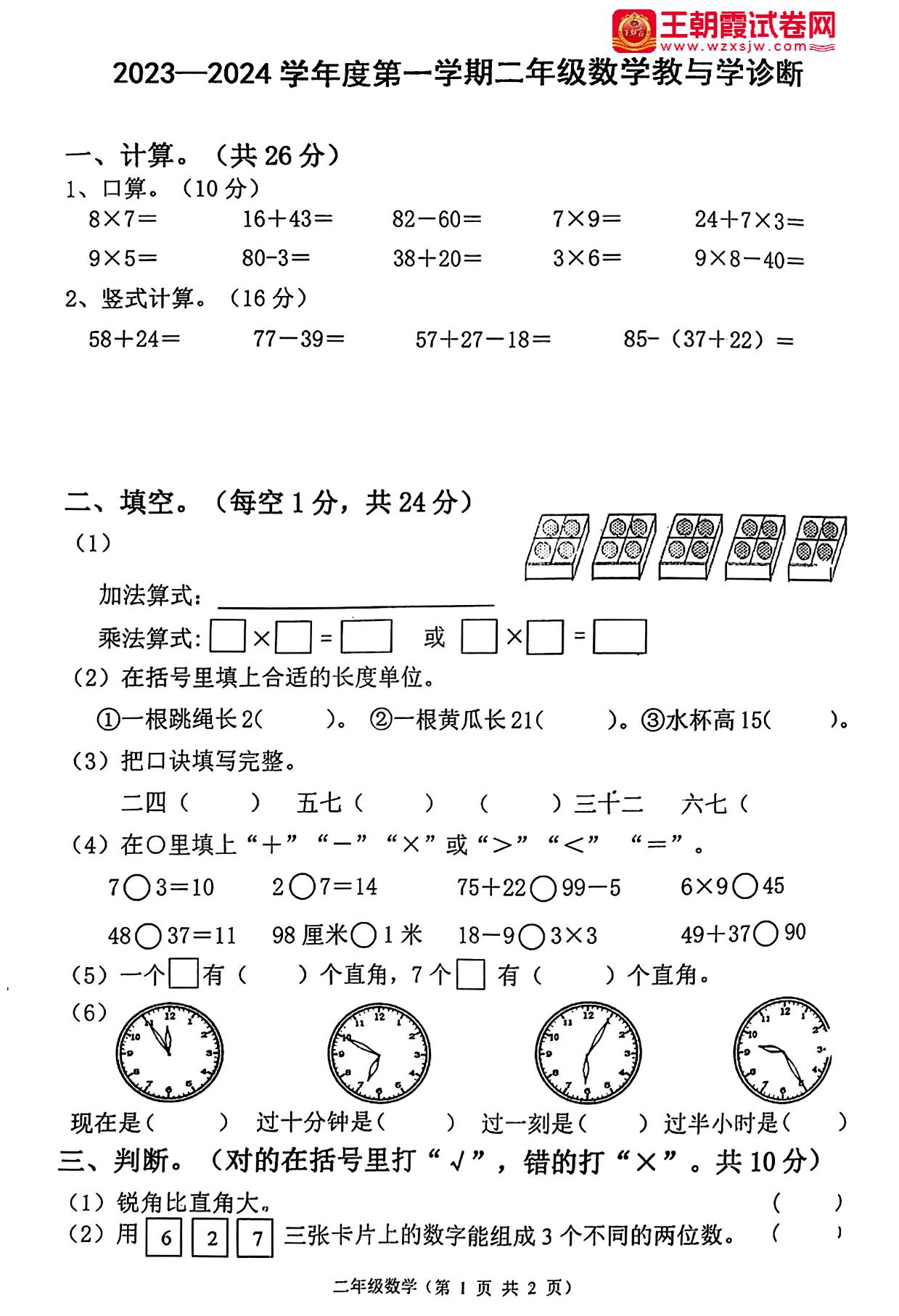 河北省唐山市丰润区2023-2024学年度第一学期期末教与学诊断试卷二年级数学(人教版)