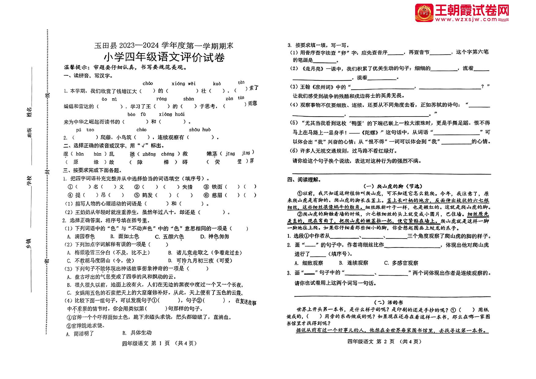 河北省唐山市玉田县2023-2024学年度第一学期期末评价试卷四年级语文(人教版)