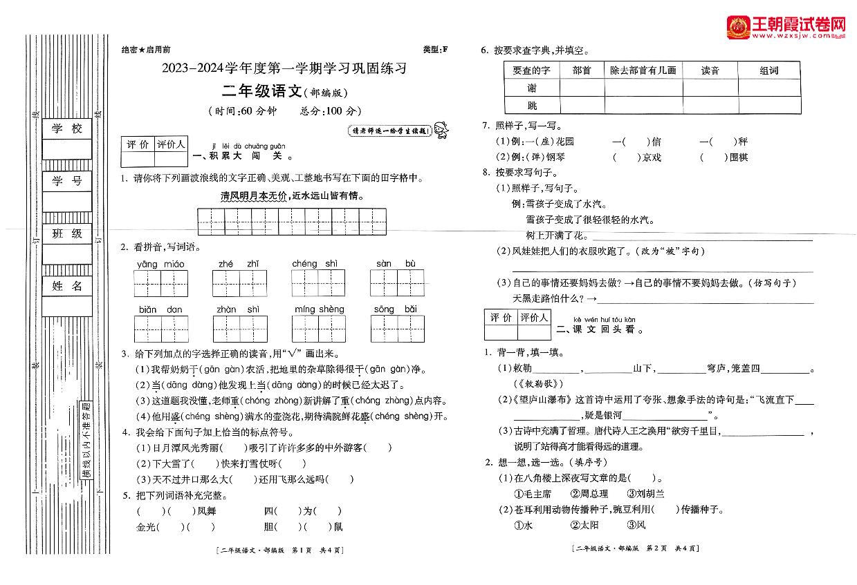 陕西省延安市富县2023-2024学年度第一学期期末学习巩固练习试卷二年级语文(人教版)