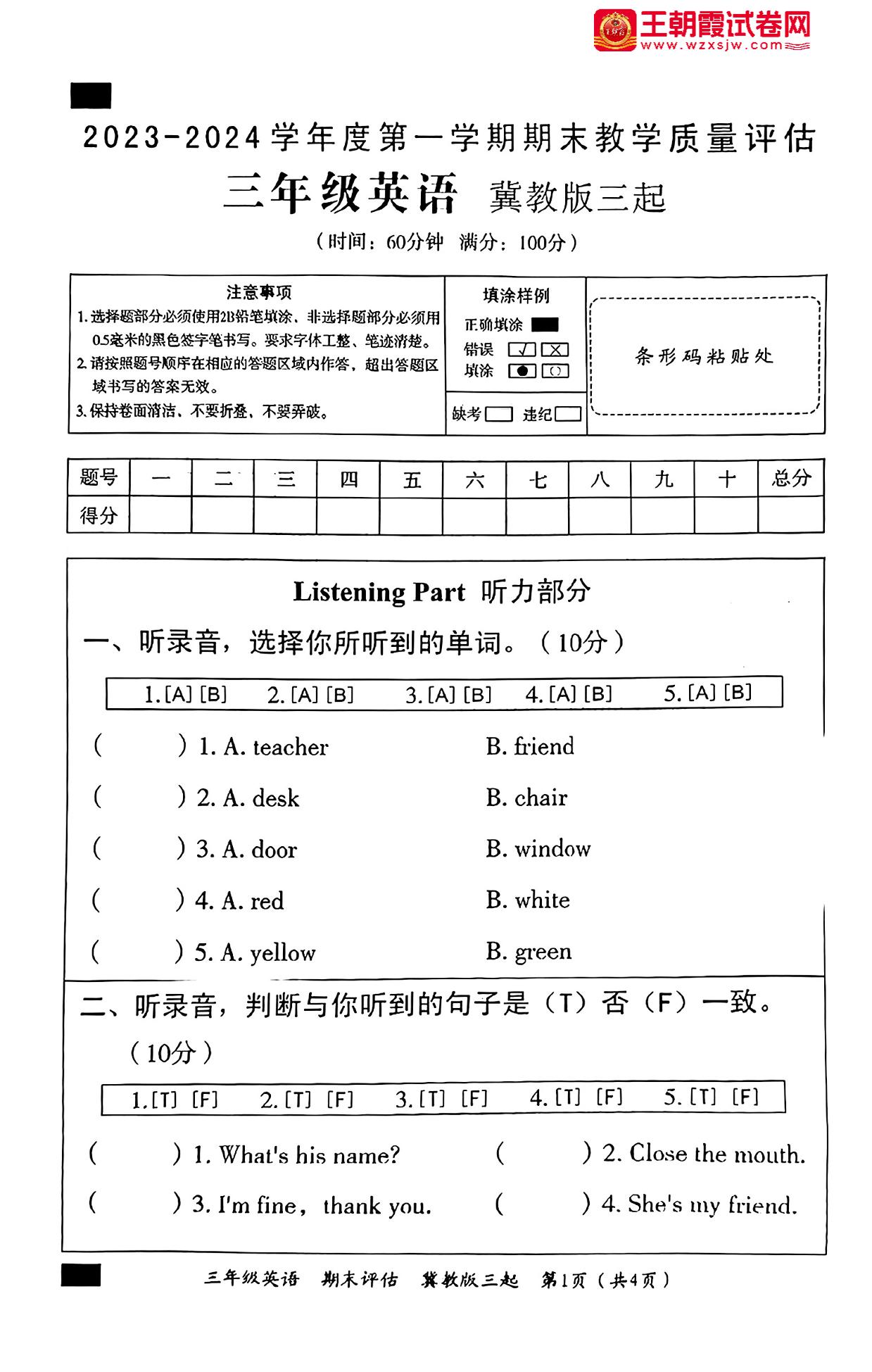 河北省邯郸市临漳县南东坊镇中心校2023-2024学年度第一学期期末教学质量评估试卷三年级英语(冀教版)【无听力音频】