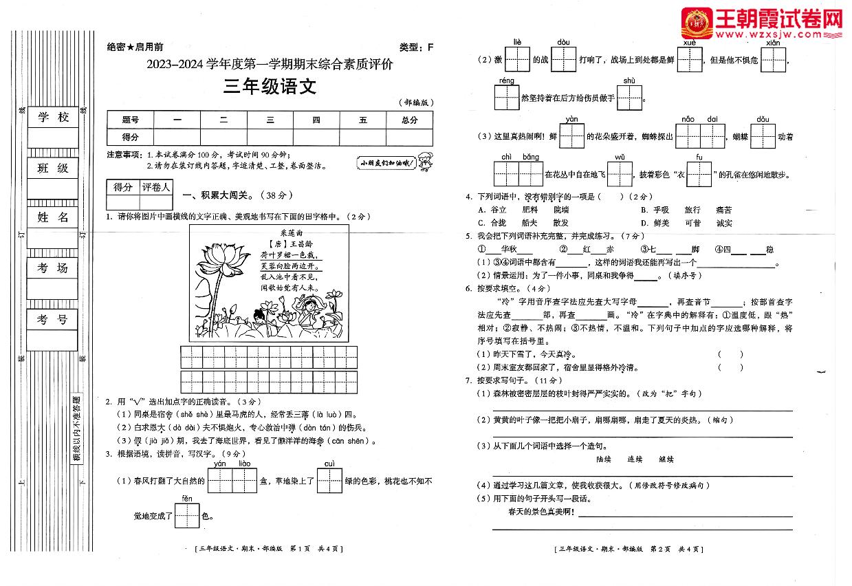 陕西省延安市富县2023-2024学年度第一学期期末综合素质评价试卷三年级语文(人教版)