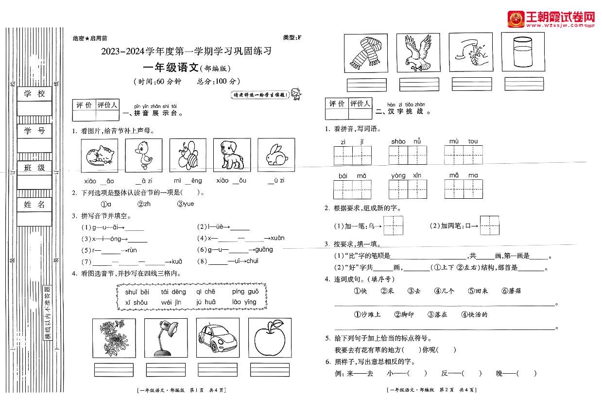 陕西省延安市富县2023-2024学年度第一学期期末学习巩固练习试卷一年级语文(人教版)