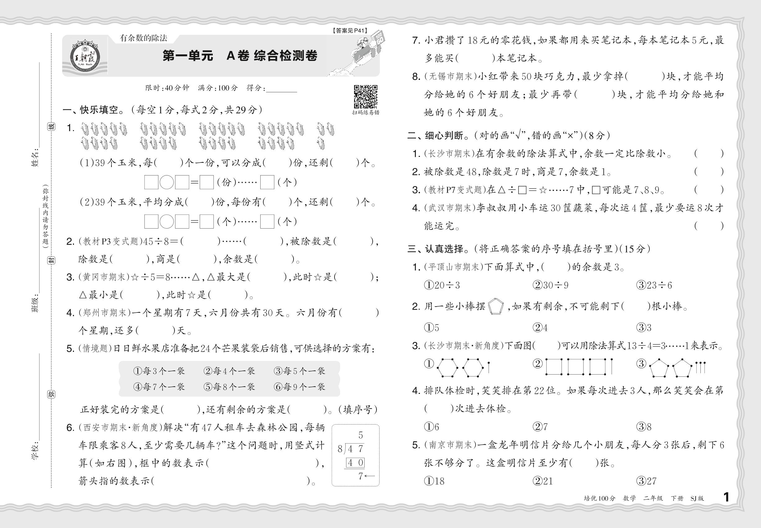 2024春下册二年级数学苏教版 第一单元 A卷 综合检测卷
