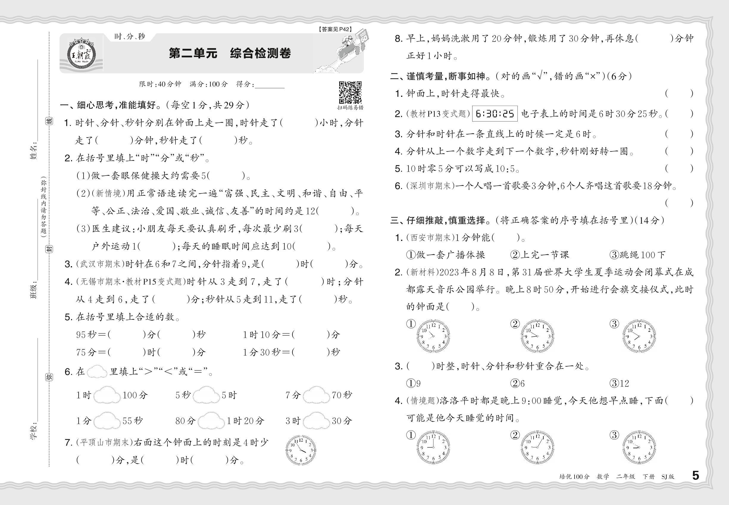二年级数学苏教版下册单元卷