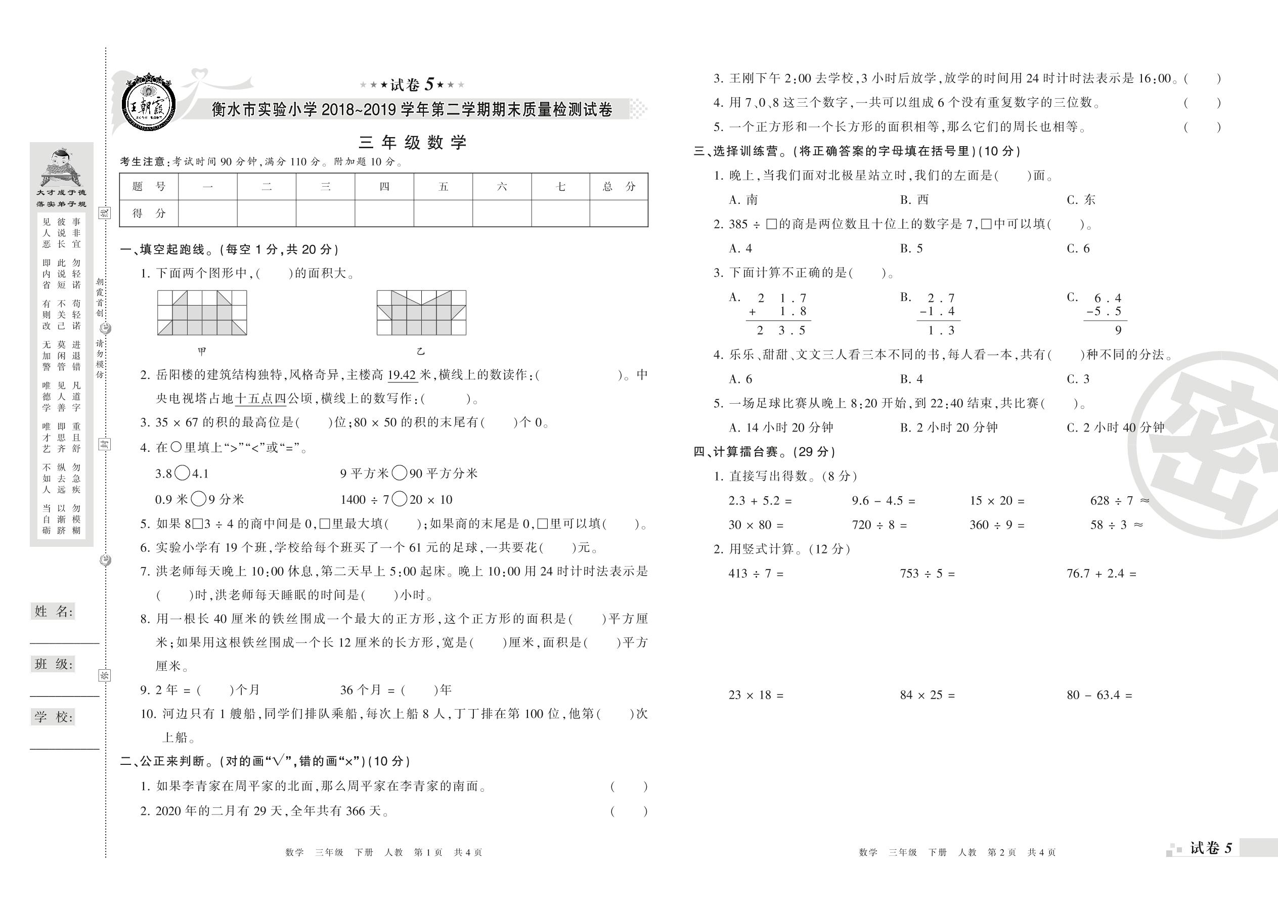 2018-2019学年第二学期衡水实验小学三年级下册数学(人教版)【5】